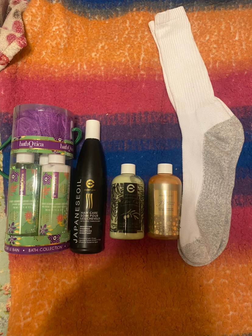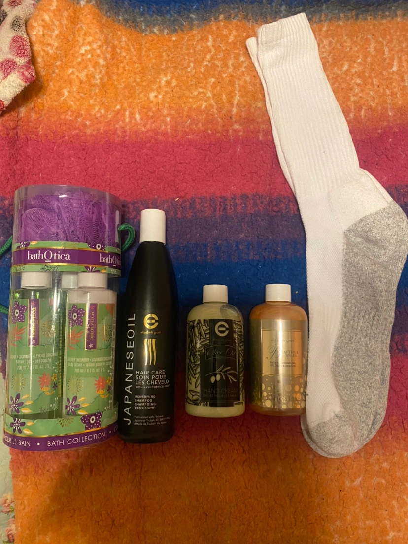 -A shampoo, a bath gel and a hand cream with another bath gel and sponge kit and a pair of long white socks for free.