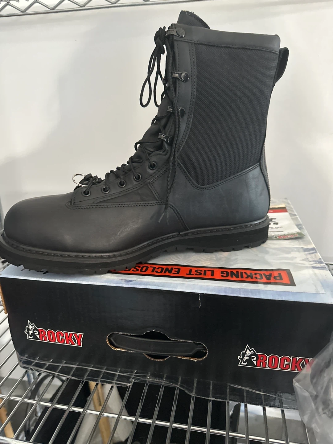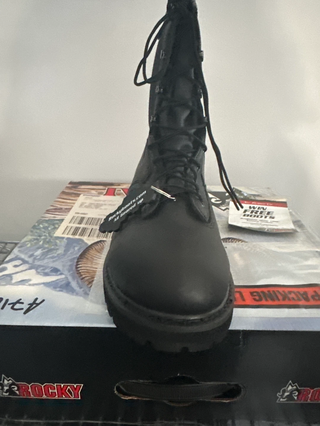 10Selling a pair of Rocky LT 8 Inch military boots in black. They appear to be in great condition and come with the original box. Great for work or outdoor activities!
