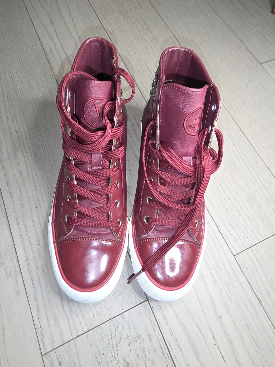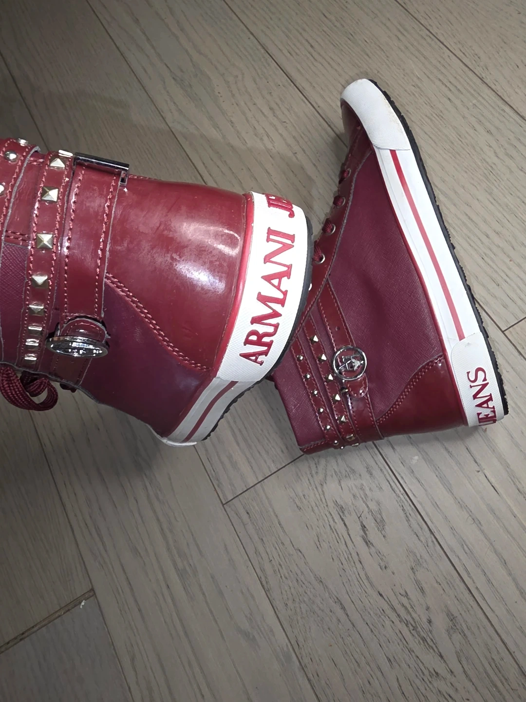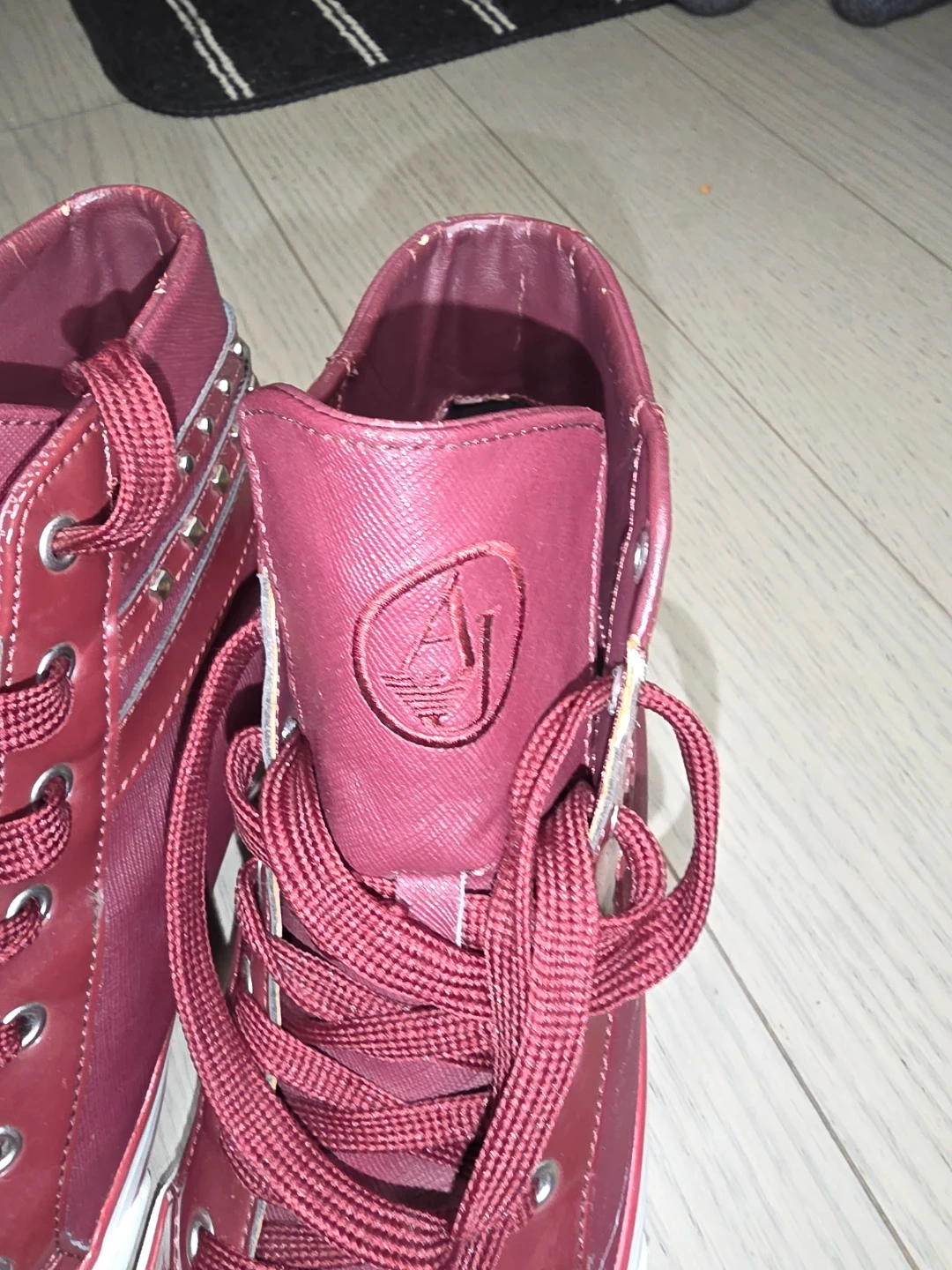 Stylish Armani Jeans high-top sneakers in a deep red colour. Features a patent and canvas upper with stud detailing and buckle accents. Rubber sole with branding on the side. These sneakers offer a unique look for casual wear. Only worn ones.