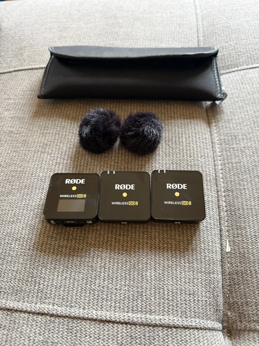 5Selling a Rode Wireless Go II dual channel wireless microphone system. Comes with everything you see in the photos, including the box and accessories. -1x receiver -2x transmitter -1x carry case 2x wind muffs Great for recording audio for videos or podcasts! Barely ever used. Dm for questions.