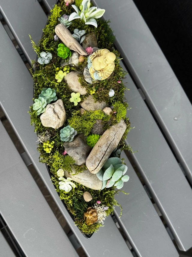 This Zen garden is a unique and tranquil decorative piece, featuring a Buddha statue, live moss, and assorted succulents arranged in a sleek, black boat-shaped bowl. It is perfect for adding a touch of serenity to any space. The Buddha is not secured and can be placed anywhere in the garden. * **Design**: Zen garden with Buddha statue * **Material**: Live moss, succulents, rocks, driftwood, and a black boat-shaped bowl * **Dimensions**: 12 inches long x 5inches wide x 5 inches high Transform your space into a haven of peace and calm with this Zen garden. Remember, if you're seeing this ad, the garden is still available, ready to bring a little serenity to your day! I've checked Kijiji and similar items are selling for between $20 and $40, so I have priced to sell at $25