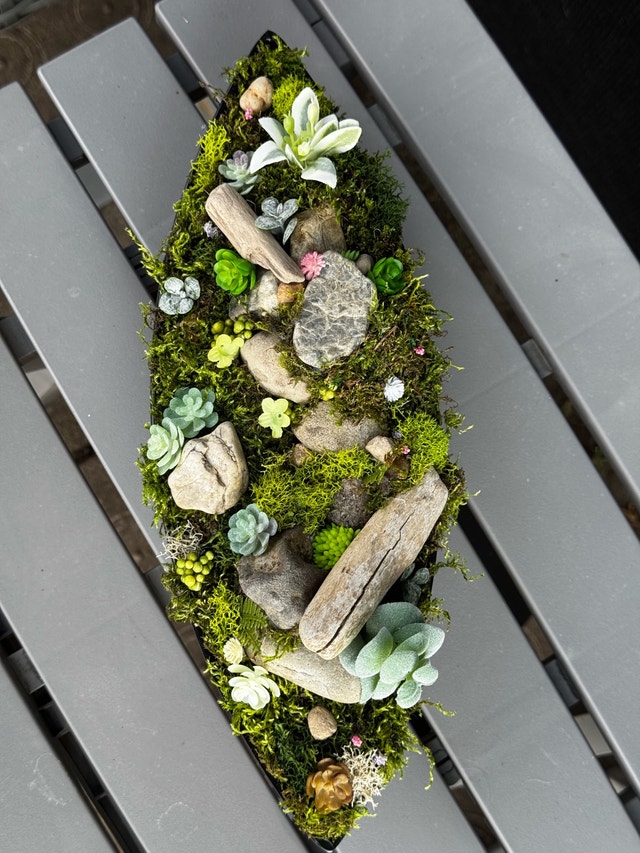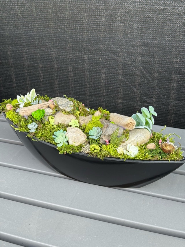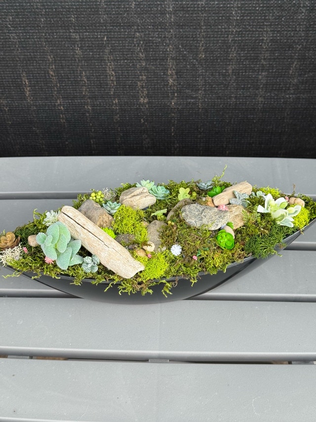 This Zen garden is a unique and tranquil decorative piece, featuring a Buddha statue, live moss, and assorted succulents arranged in a sleek, black boat-shaped bowl. It is perfect for adding a touch of serenity to any space. The Buddha is not secured and can be placed anywhere in the garden. * **Design**: Zen garden with Buddha statue * **Material**: Live moss, succulents, rocks, driftwood, and a black boat-shaped bowl * **Dimensions**: 12 inches long x 5inches wide x 5 inches high Transform your space into a haven of peace and calm with this Zen garden. Remember, if you're seeing this ad, the garden is still available, ready to bring a little serenity to your day! I've checked Kijiji and similar items are selling for between $20 and $40, so I have priced to sell at $25