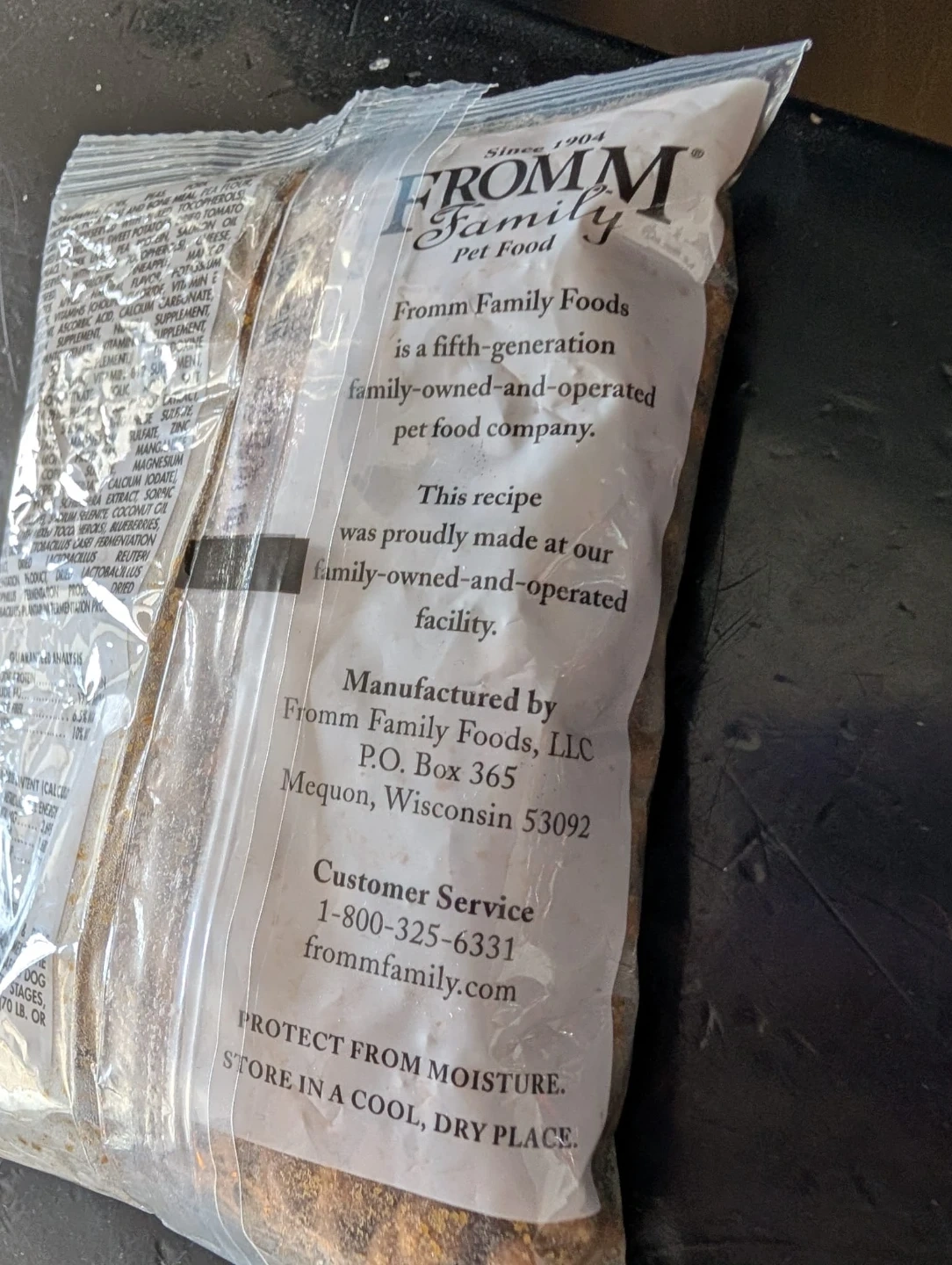 Fromm Family Pet Food Pork & Peas recipe dog food. It's a Polynesian-inspired entrée with pork, peas, pork broth, and assorted fruits and vegetables. Manufactured by Fromm Family Foods, LLC.