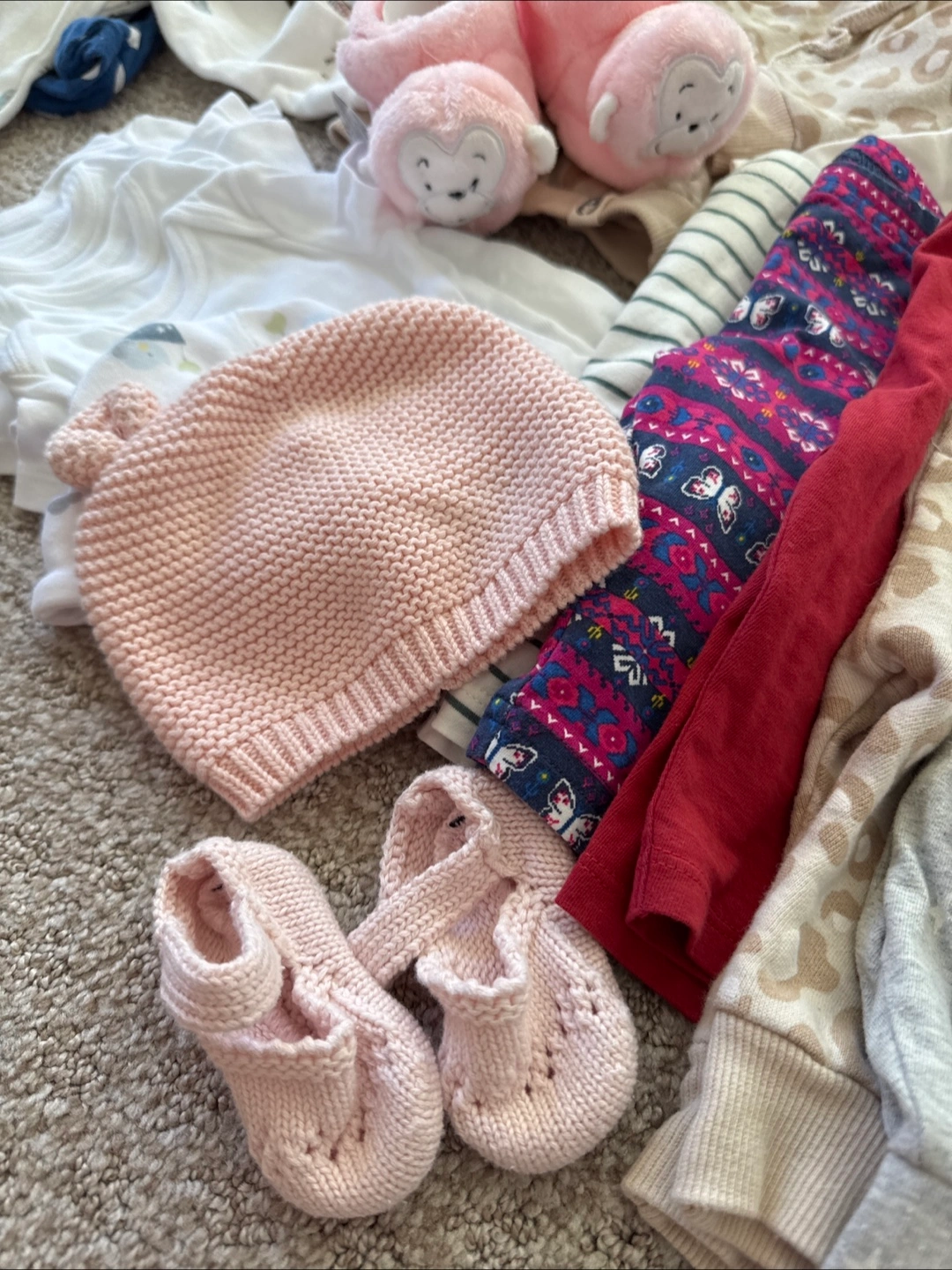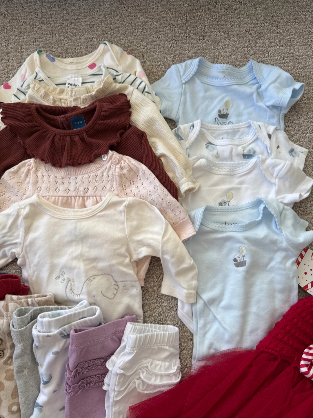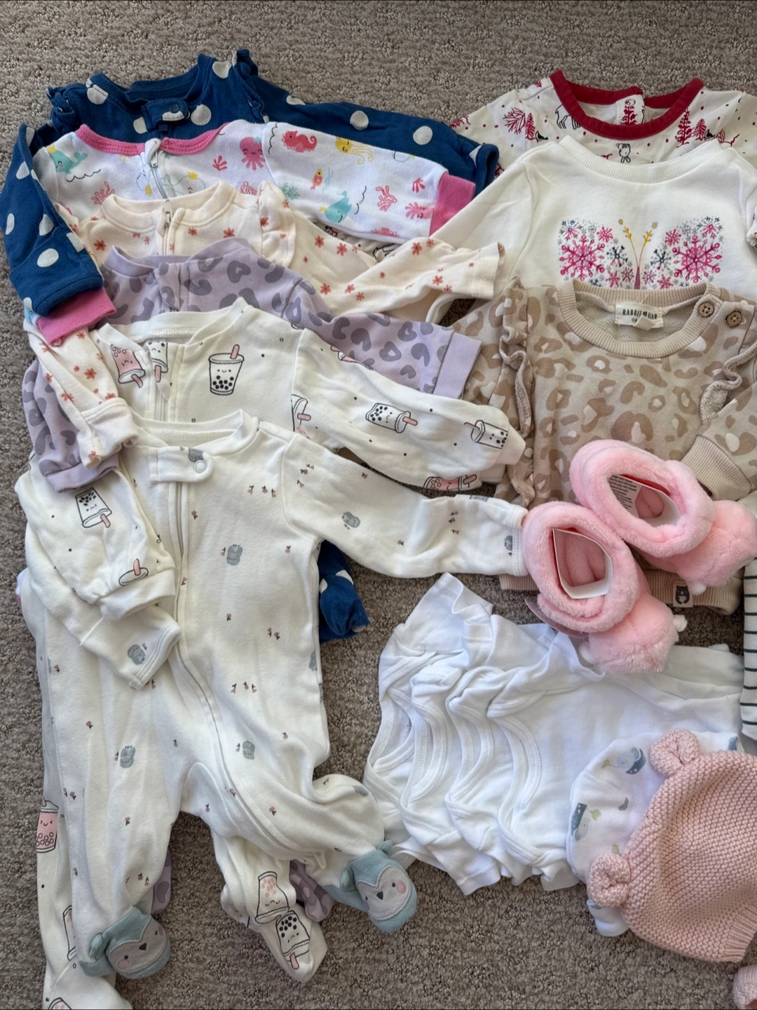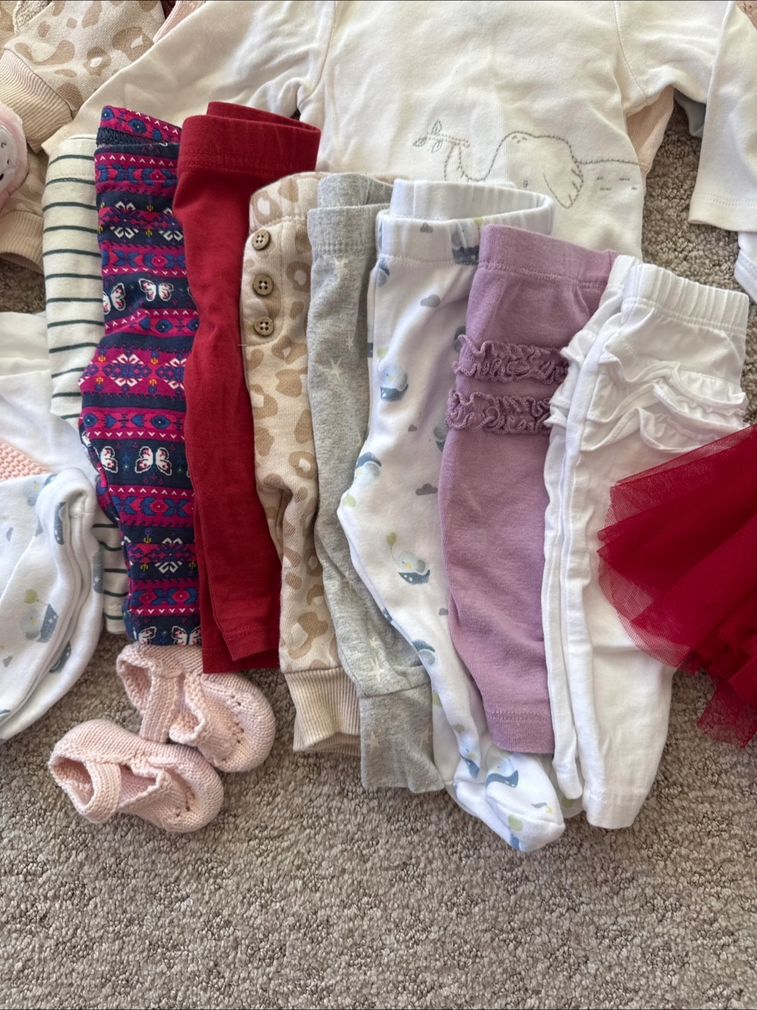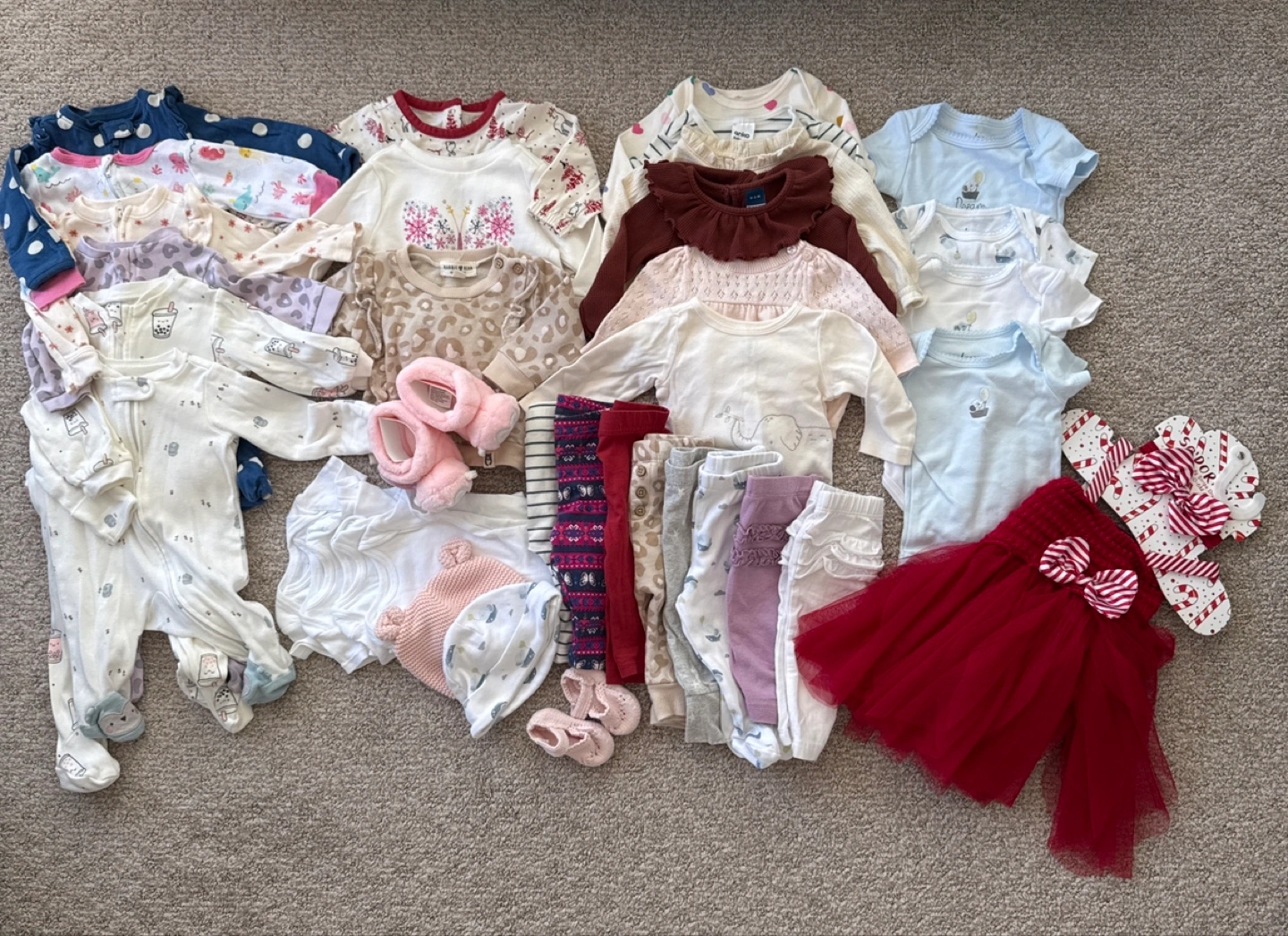 Large bundle (36 pieces) of baby girl clothes, size 0-3 months. Includes bodysuits, long and short sleeve shirts, leggings, pants, a dress, hat, and booties. Various colours and patterns. Gently used.