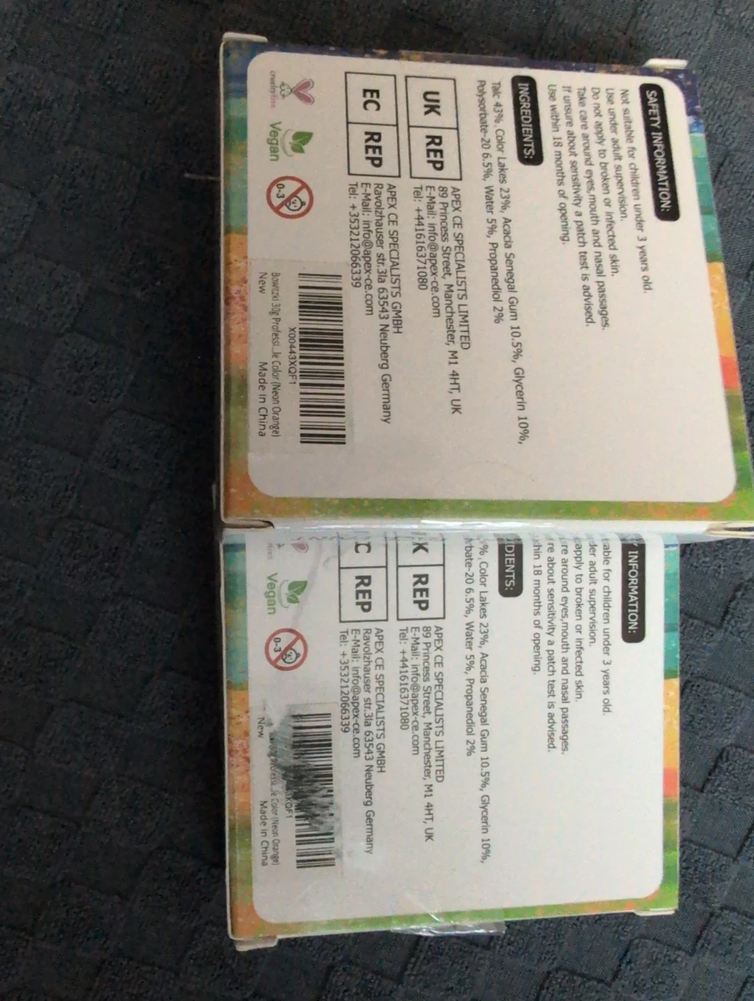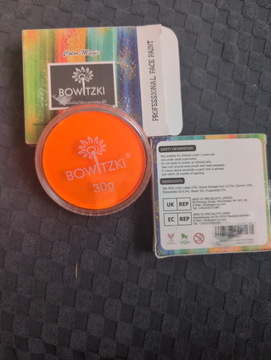 New in box, This is a Bowitzki Professional Face Paint kit in orange. It's water-based and non-toxic. The paint is 30g and comes in a reusable container. Price is for 1 and 2 for 10.