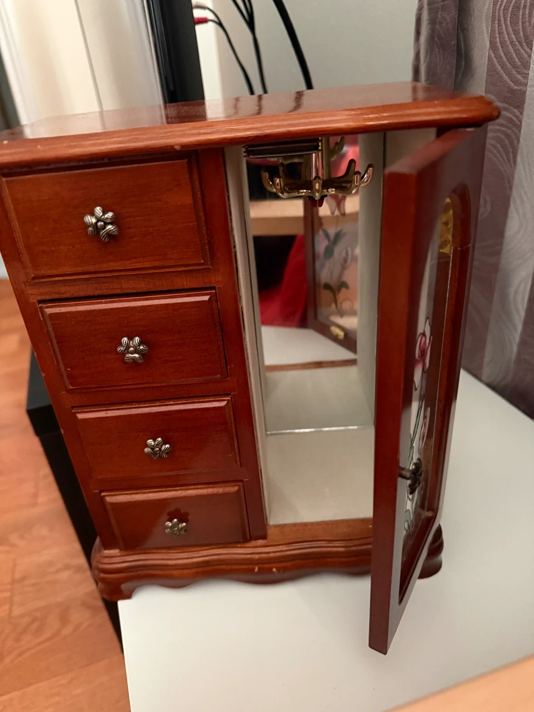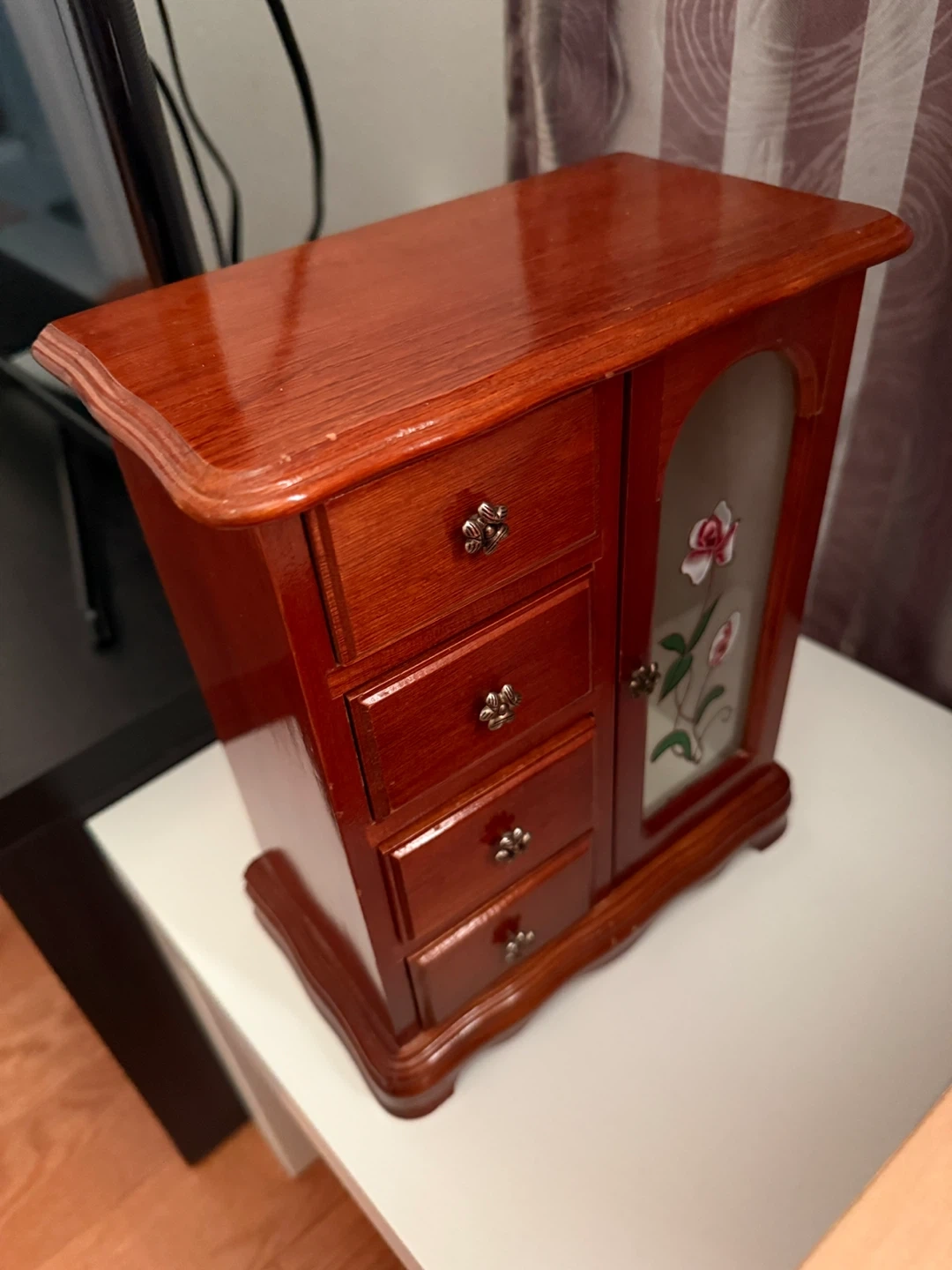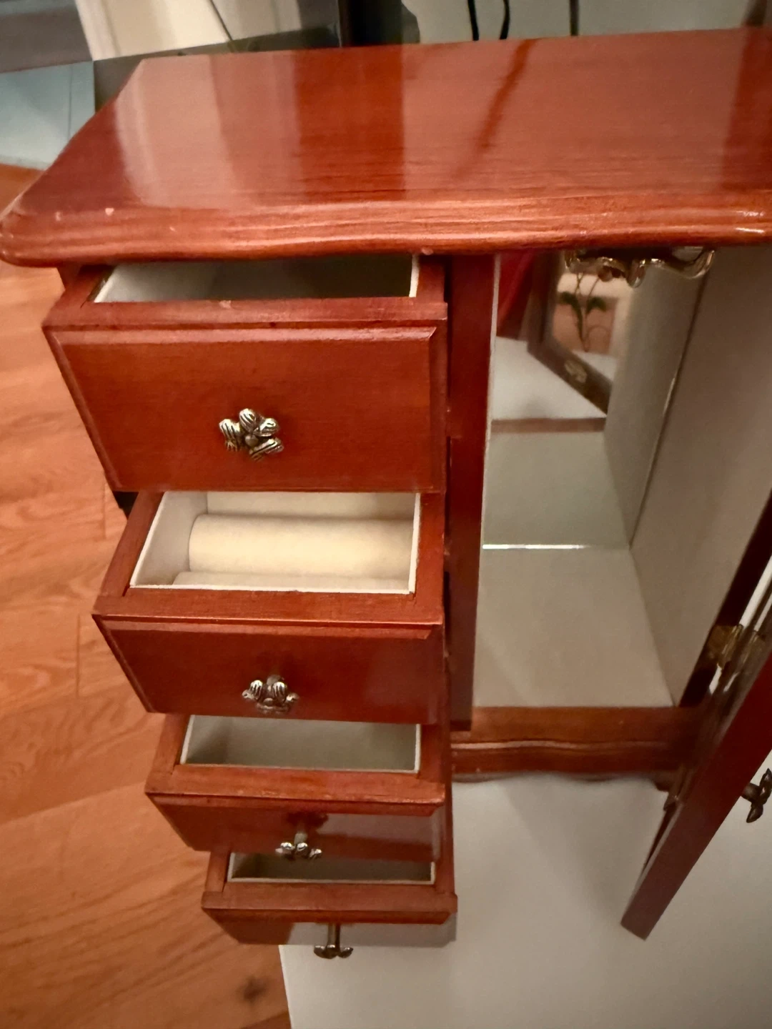 This is a lovely wooden jewellery box with four drawers and a mirrored door. It's perfect for storing all your accessories! The inside is lined with soft fabric to protect your items.