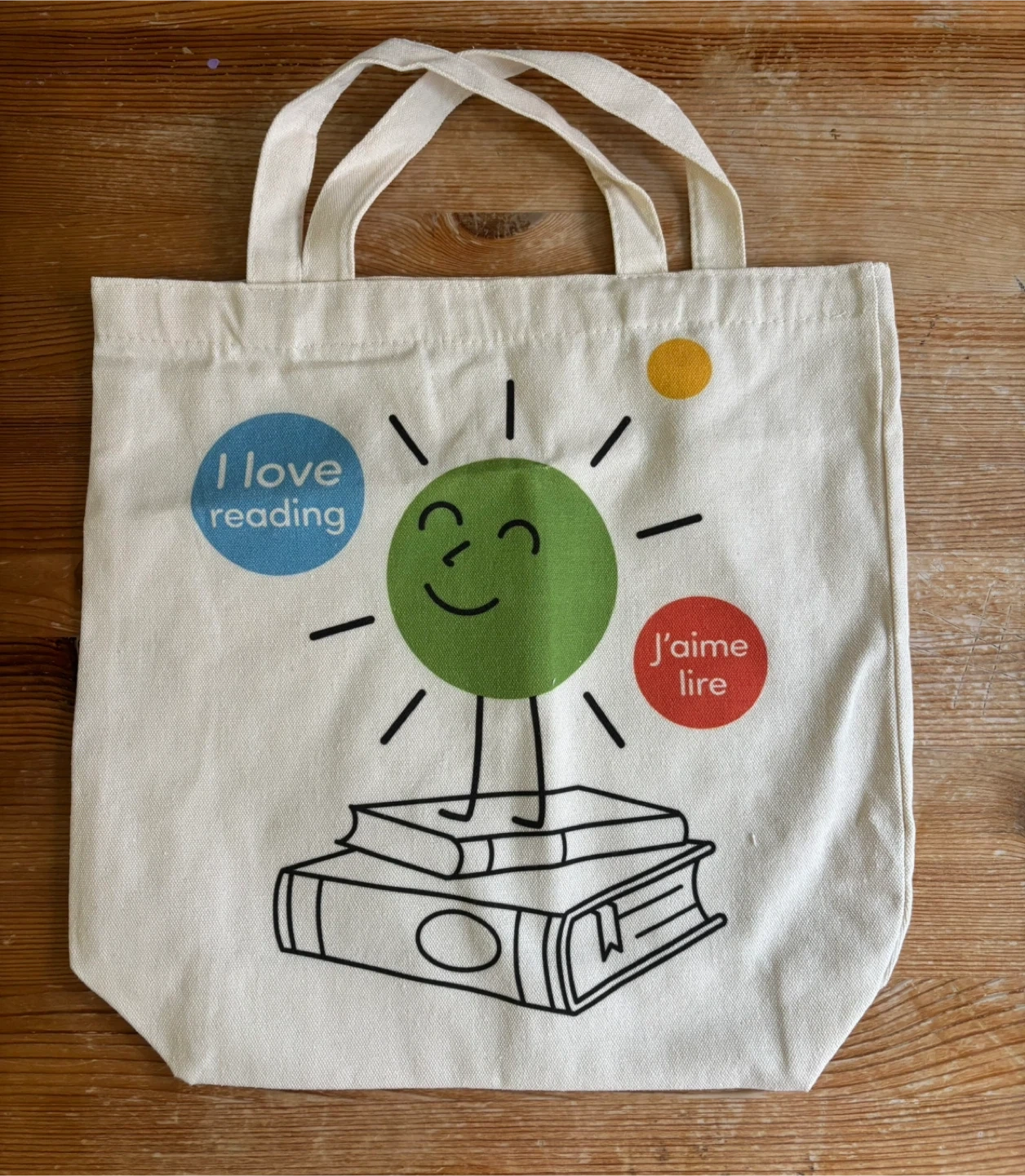 Canvas tote bag with a fun graphic of a smiling sun character standing on books. It says "I love reading" and "J'aime lire" on the sides. This bag is great for carrying books or everyday items.