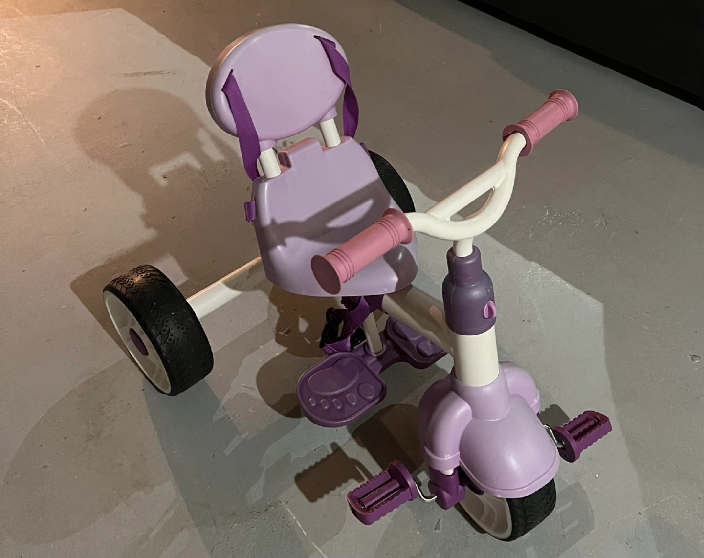 Lilac and white tricycle for toddlers. It has adjustable seat straps and handlebar grips. Fun for outdoor adventures!