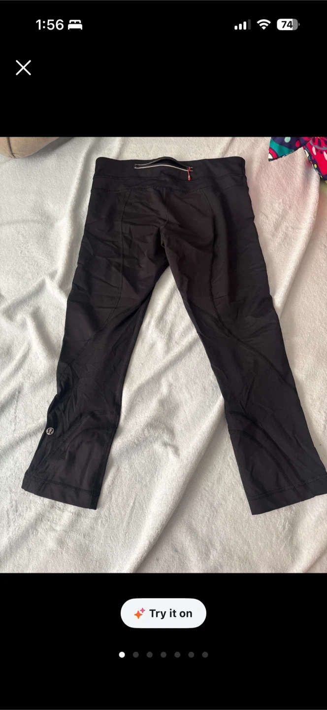 Lululemon black crop athletic pants. These pants have a zippered pocket at the back waistband. They're made of a stretchy, breathable material. Perfect for running or gym workouts! Pick up cash only