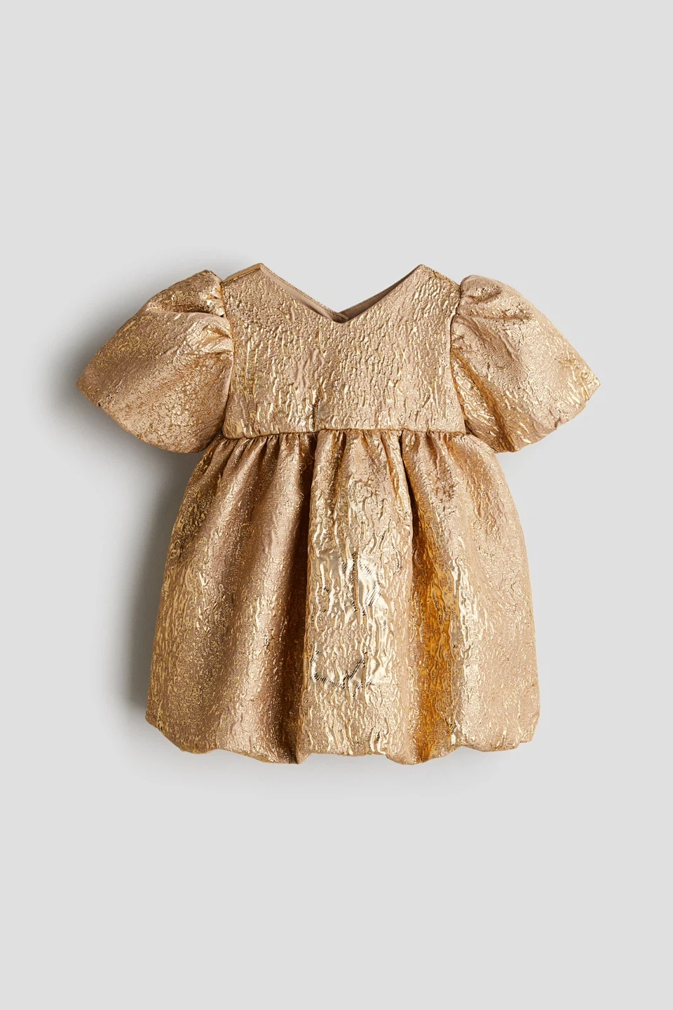 Dress in a shimmery jacquard-weave fabric. V-neck, short puff sleeves with folded-in cuffs, gathers at midsection, and a voluminous balloon skirt. Buttons at back.