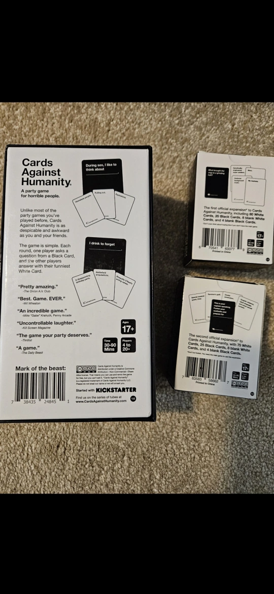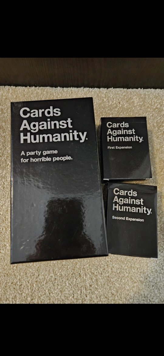 Cards Against Humanity party game. Includes base game, first expansion, and second expansion. Used but in good condition.