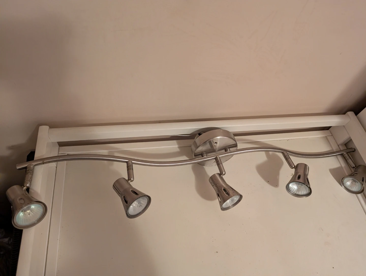 This is a 5-light metal track lighting fixture. It's made of brushed nickel-finished metal. The fixture has a wavy bar design with adjustable spotlight heads. It's a practical lighting solution for any room.