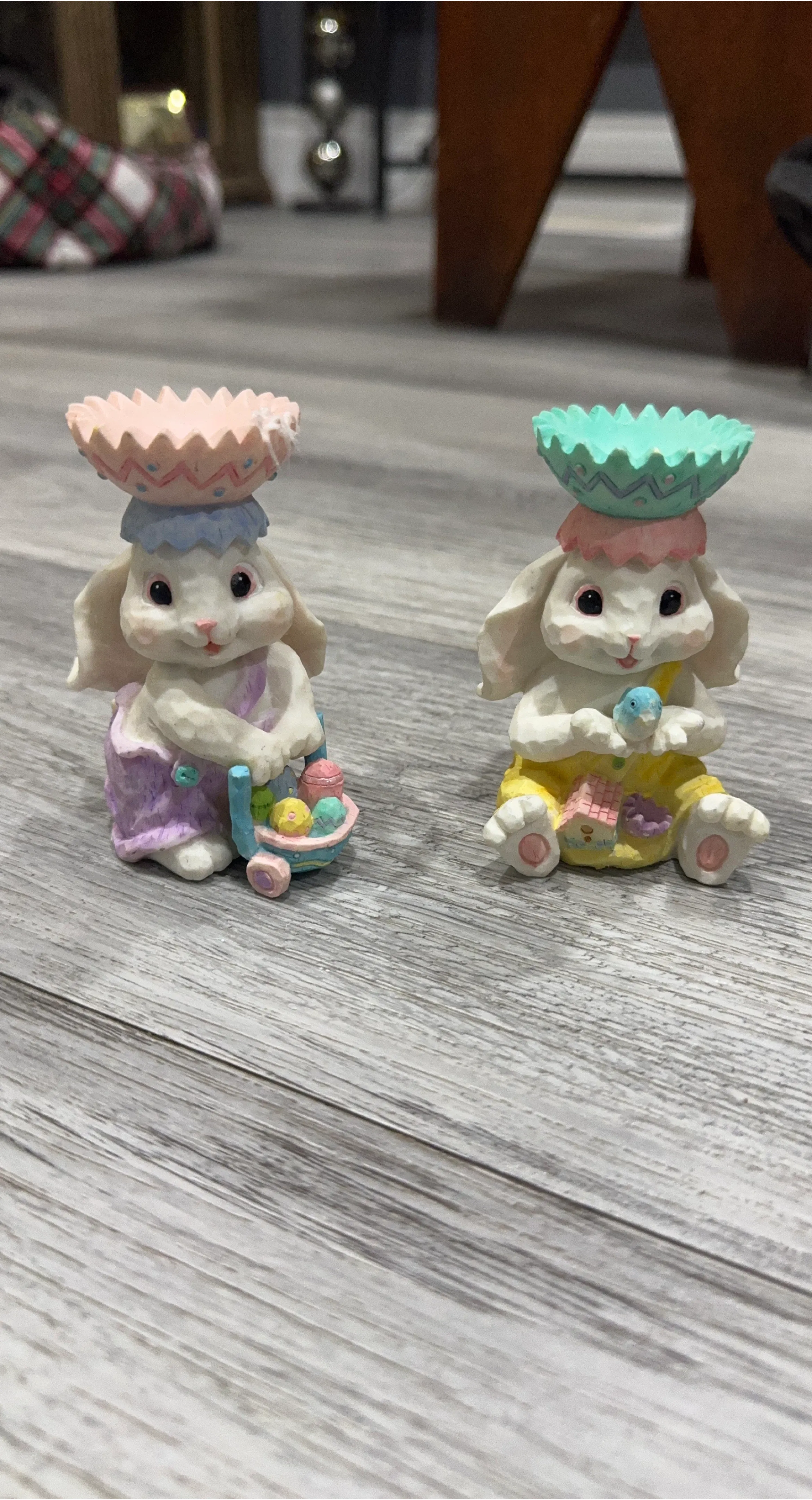 A set of two adorable Easter bunny figurines, perfect for your spring decor. One bunny carries a basket filled with colourful eggs, and the other holds a little blue bird. They're made of resin with pastel accents.