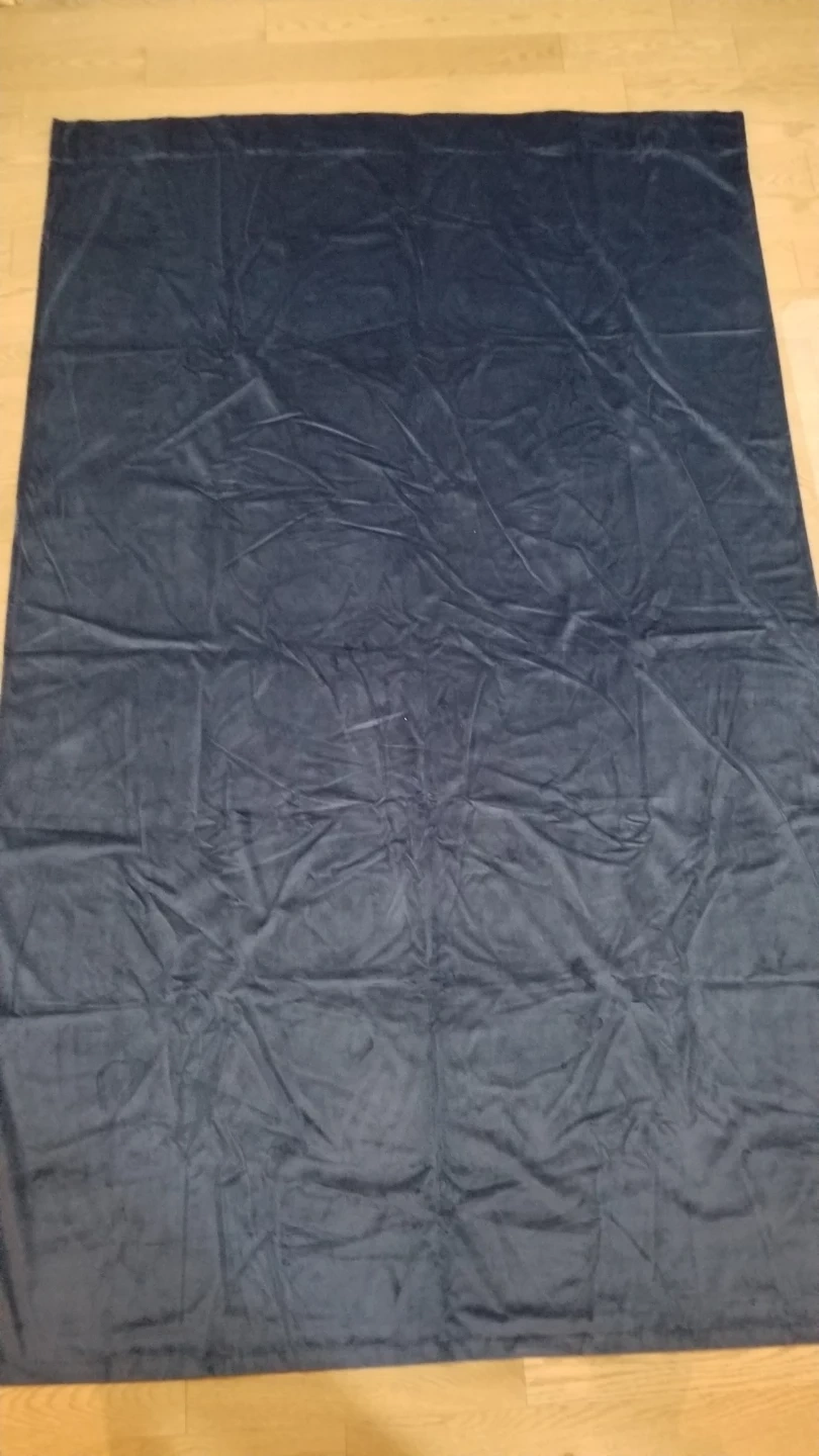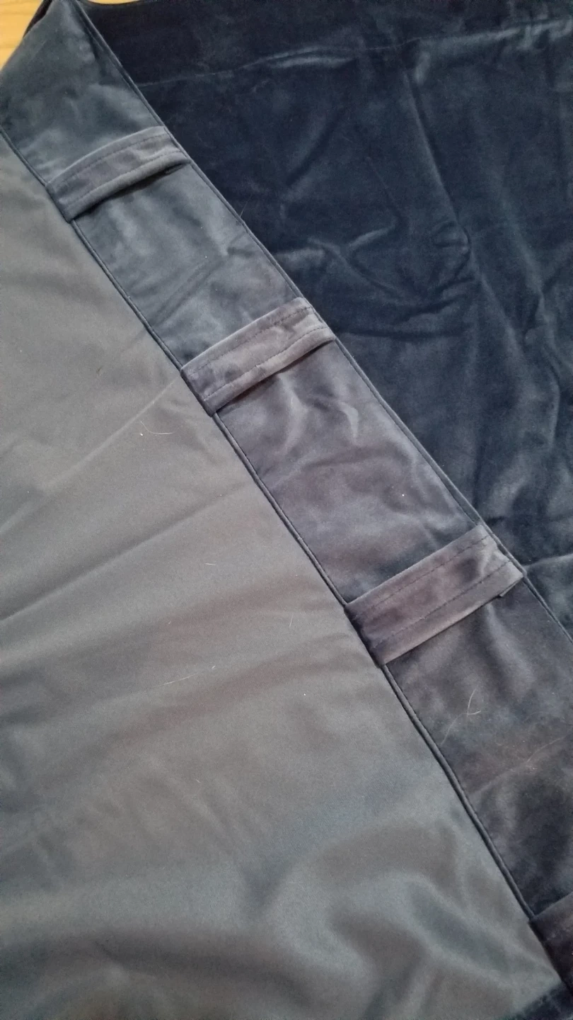 4 panels of navy blue velvet curtains with a smooth, dark lining. It's made of soft velvet material. This curtain is great for blocking light in a bedroom.