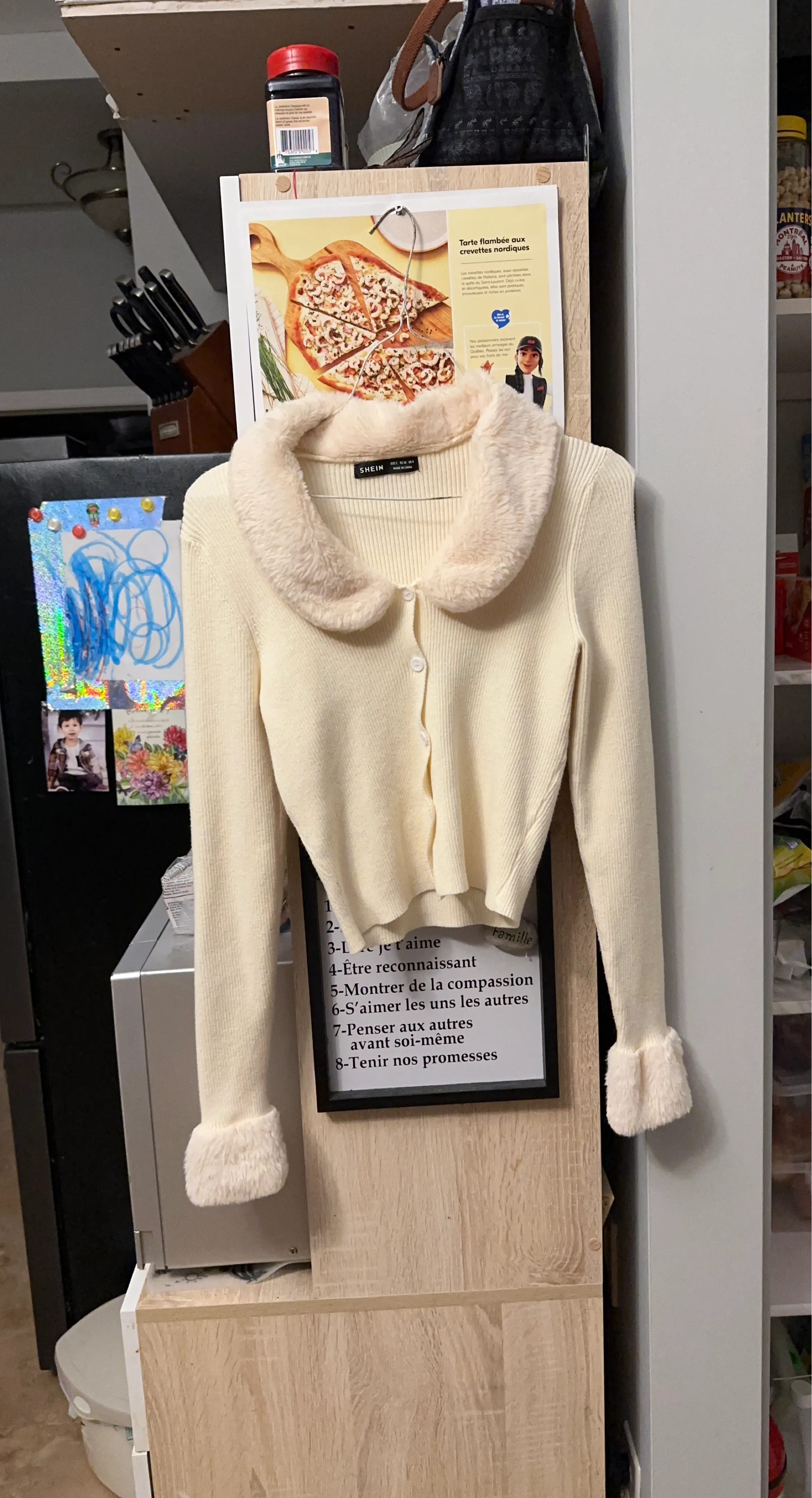 Chandail couleur crème de la marque Shein. Doté d'un col rond orné de fausse fourrure et de poignets assortis. Fermeture par boutons sur le devant. Parfait pour ajouter une touche de douceur à votre garde-robe.