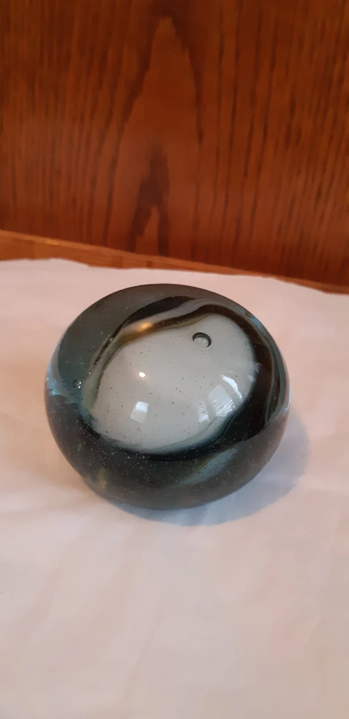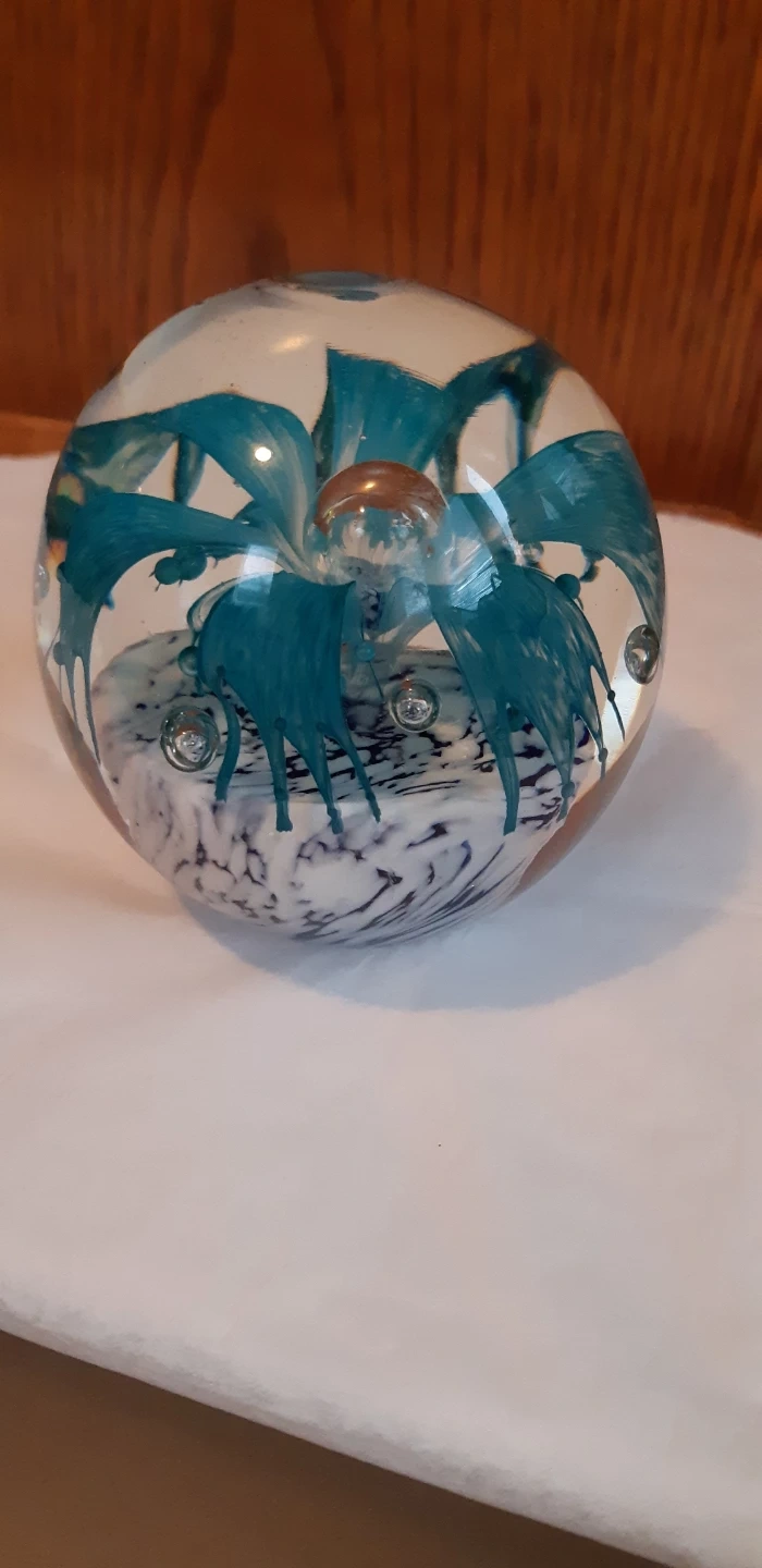This is a collection of 5 beautiful glass paperweights. Each one is handmade and features a unique design.