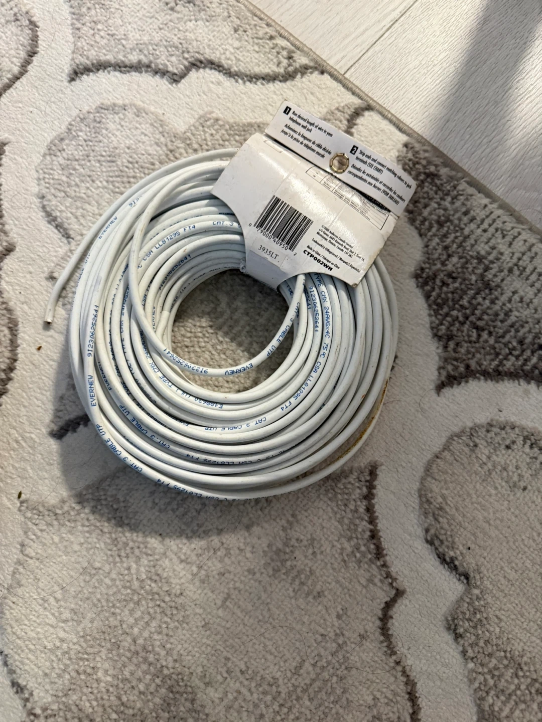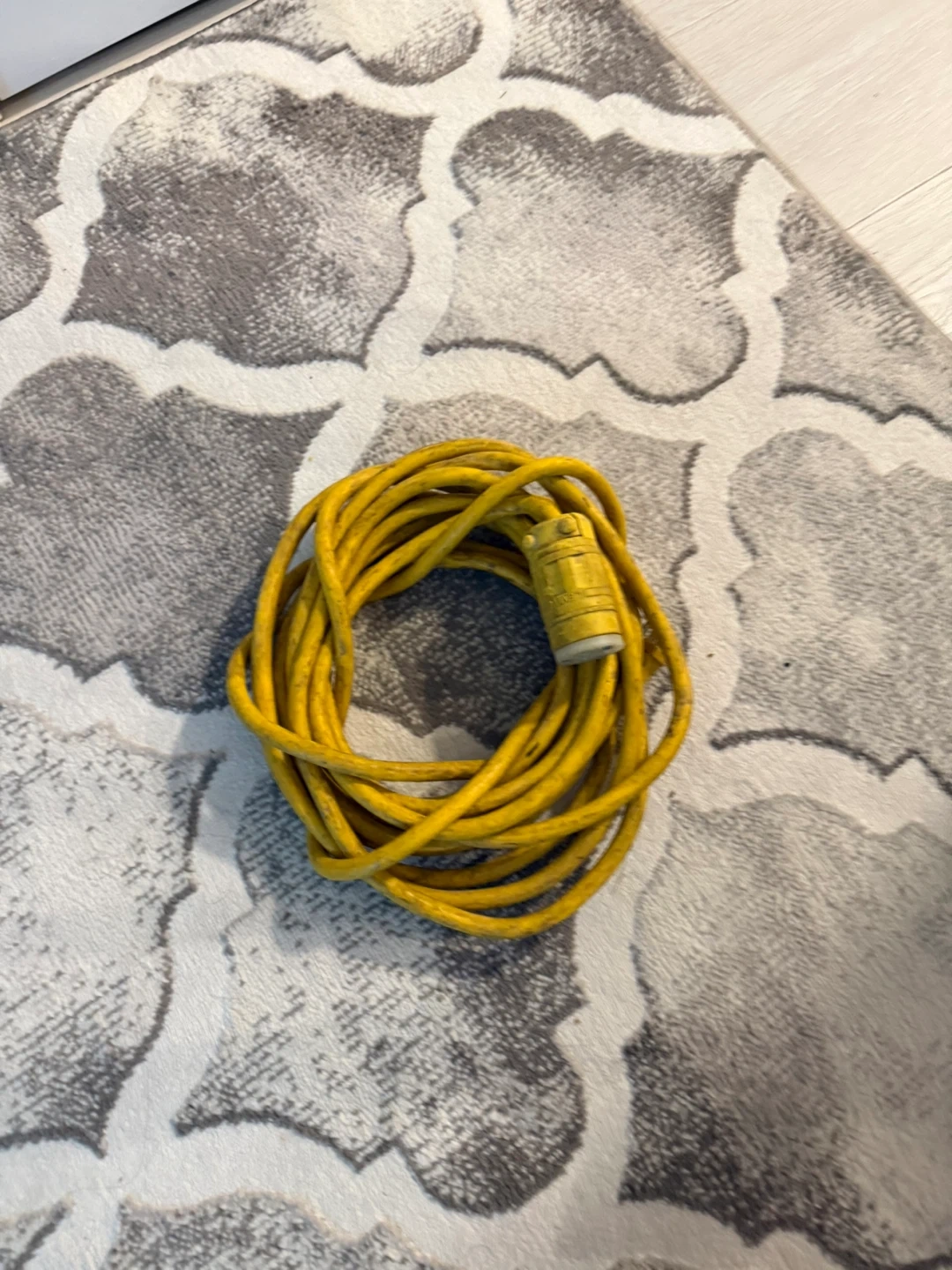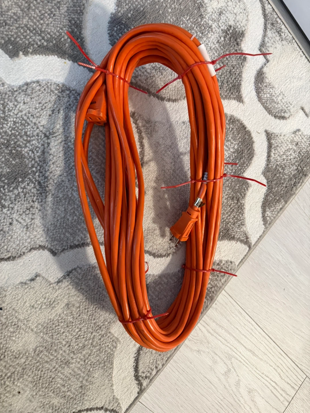 I have a few different extension cords available. There's a white cable, a yellow extension cord, and an orange extension cord. They're all in good condition and ready to use!