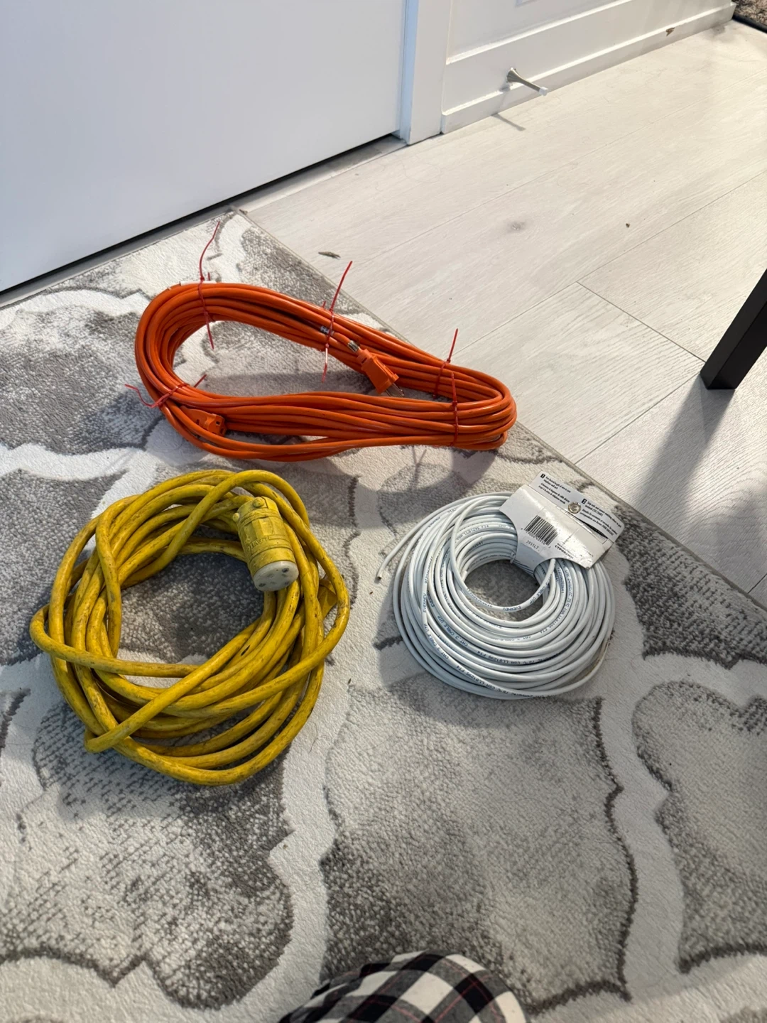 I have a few different extension cords available. There's a white cable, a yellow extension cord, and an orange extension cord. They're all in good condition and ready to use!