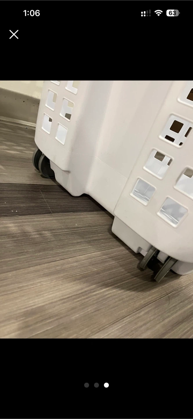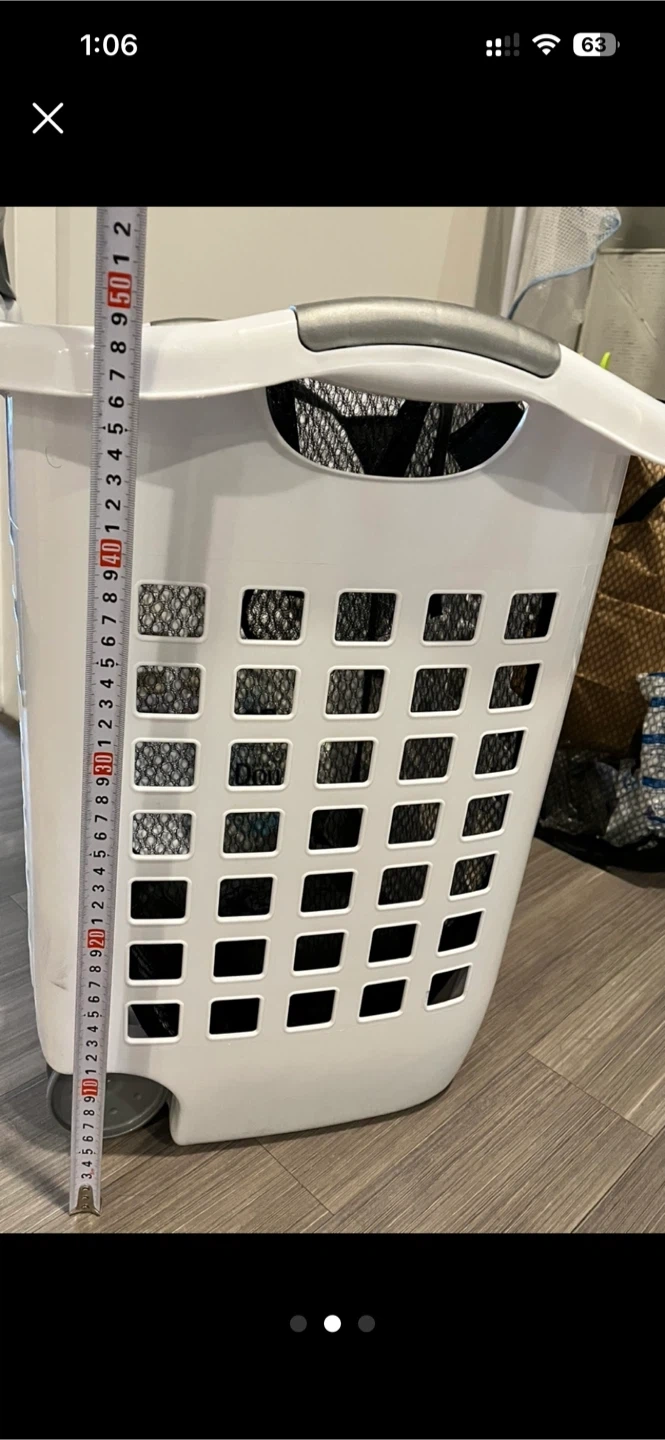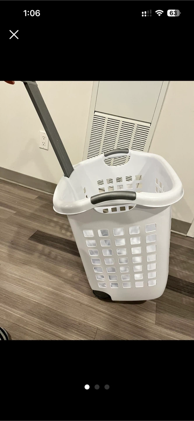 This white laundry basket has wheels and a retractable handle for easy transport. It's made of durable plastic with a ventilated design. The basket is approximately 24 inches tall.