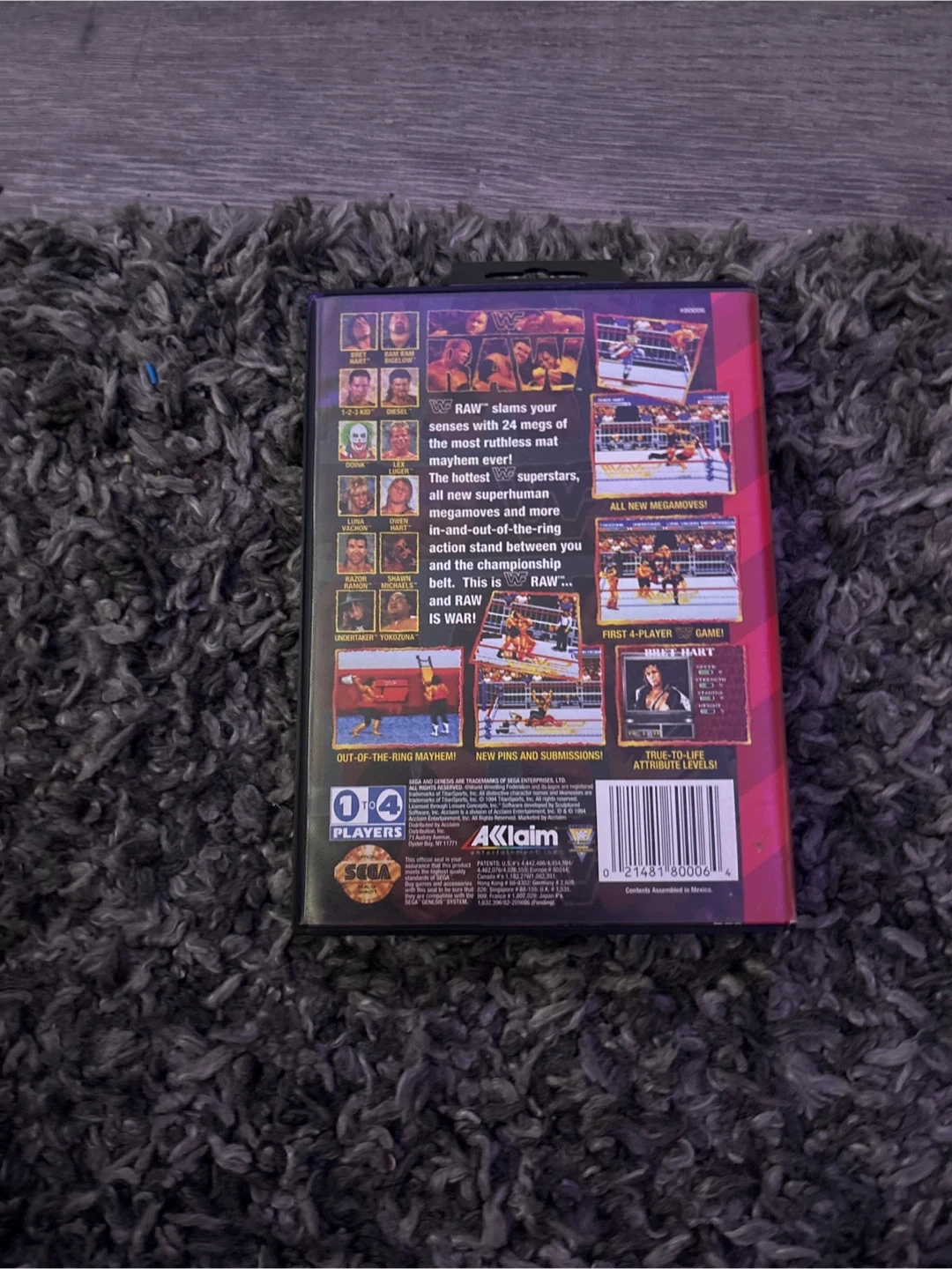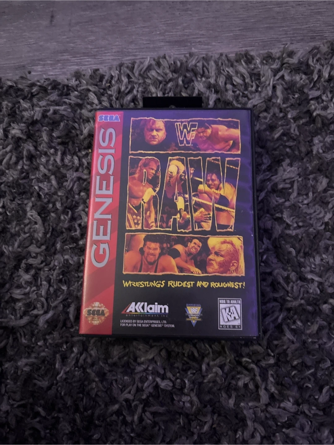 WWF RAW for the Sega Genesis. Features superstars, megamoves, and submissions. Includes original case and instruction manual. This game is rated KA for Kids to Adults.