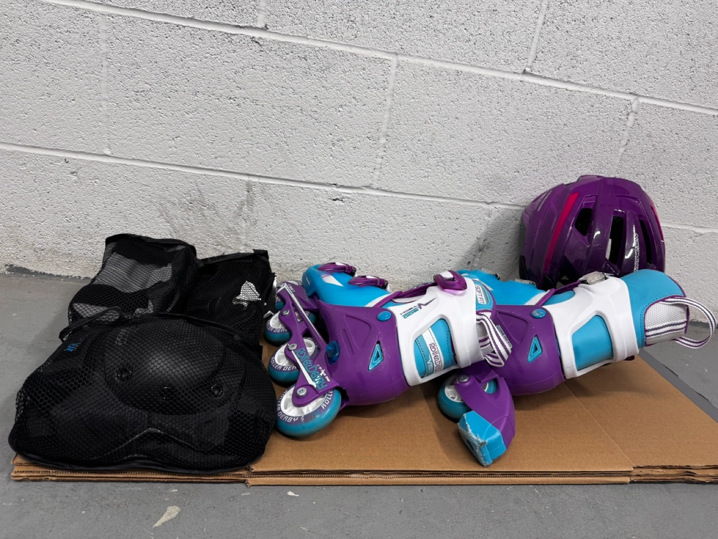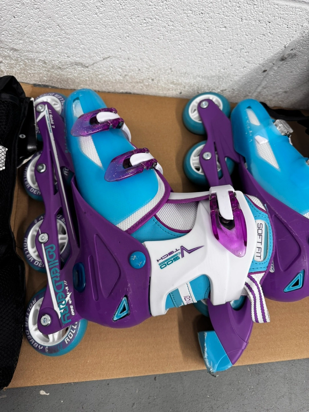 Inline skates, helmet, and pads. Blue and purple colour scheme. Adjustable size. Fits size 6-9 (women’s). Used only a couple of time to practice. Very good condition. Kept in a very clean smoke-free pet-free home!