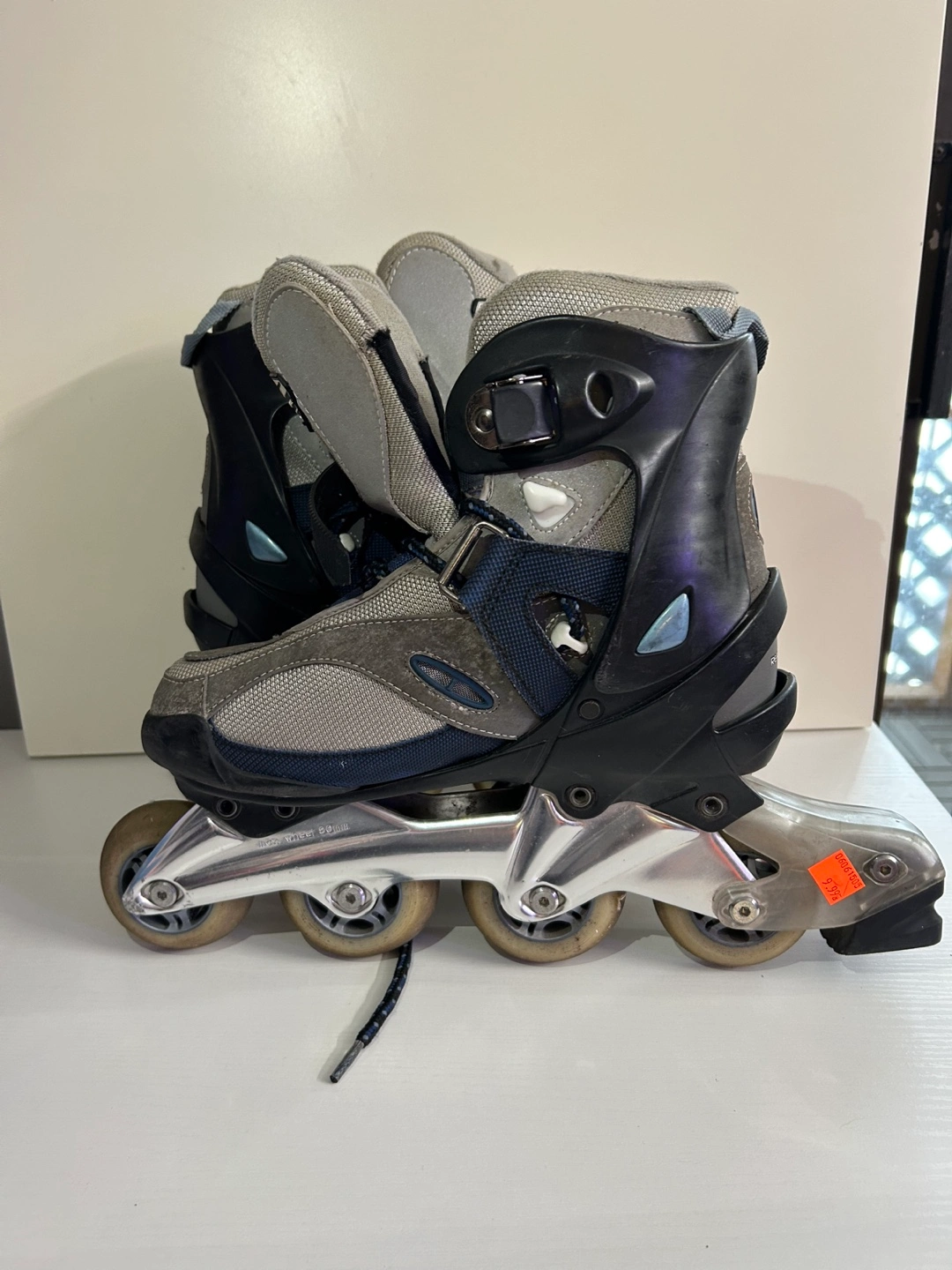 10Inline skates, grey and blue with black accents. Includes a pair of wheels and an adjustable strap. Bought for $10 decided I’m too clumsy to roller blade. $5
