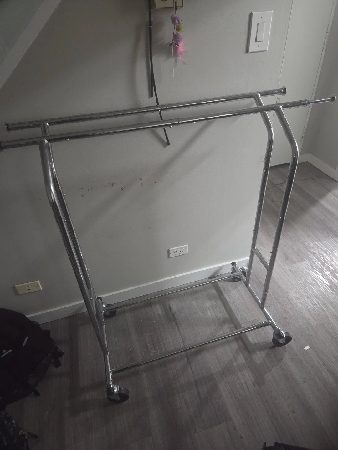 15Selling a sturdy rolling garment rack! Perfect for organizing your clothes with its double-rail design. It's easy to move around thanks to the wheels. Great for extra storage or creating a pop-up shop vibe