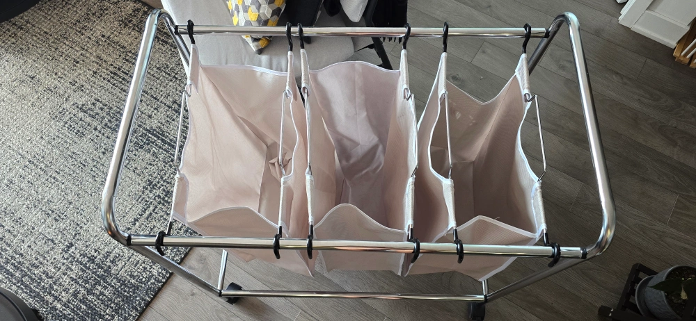 This rolling laundry sorter is perfect for keeping your laundry organized! It features three removable bags, making it easy to sort your clothes. The frame is made of sturdy metal and has wheels for easy moving. Originally bought for $77.98 Measurements are 30.5" L x 18" W x 33" H