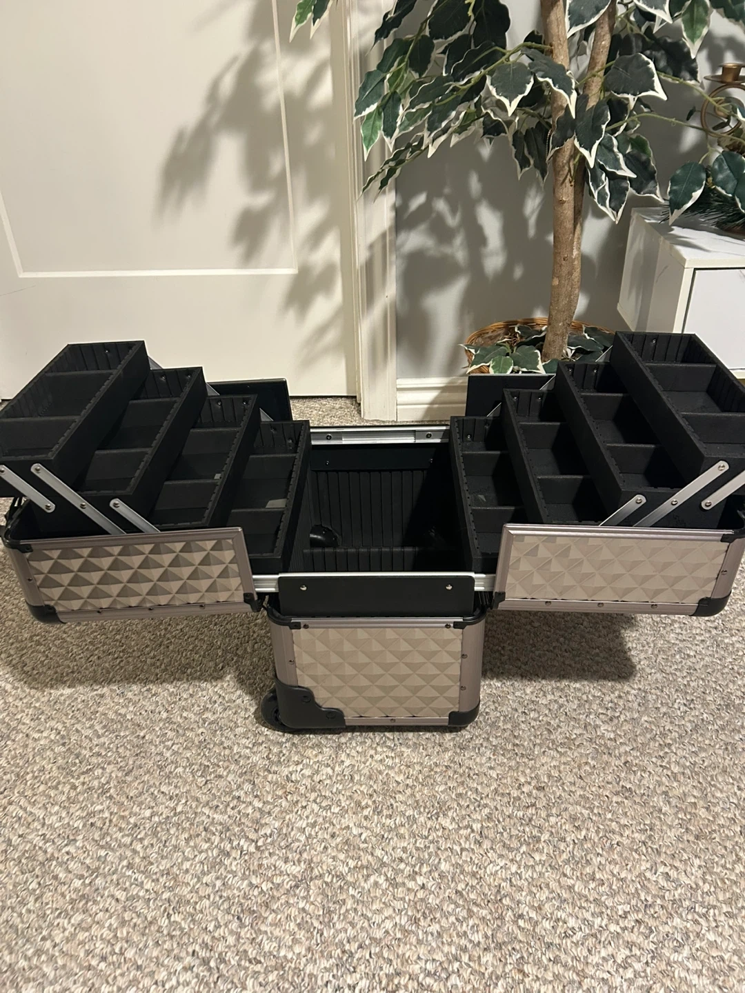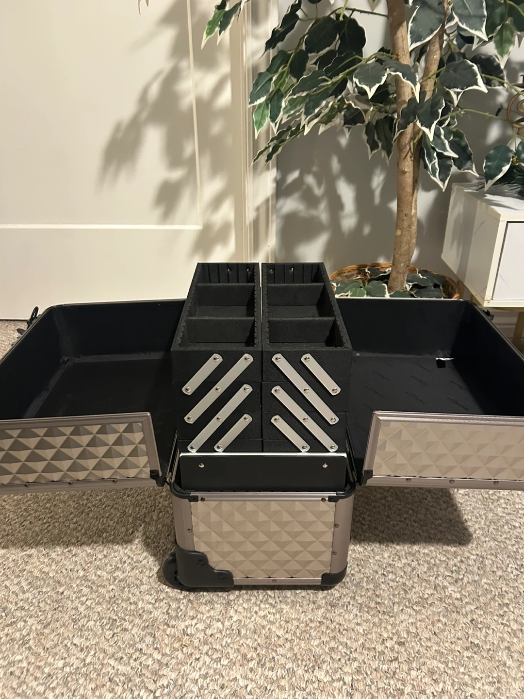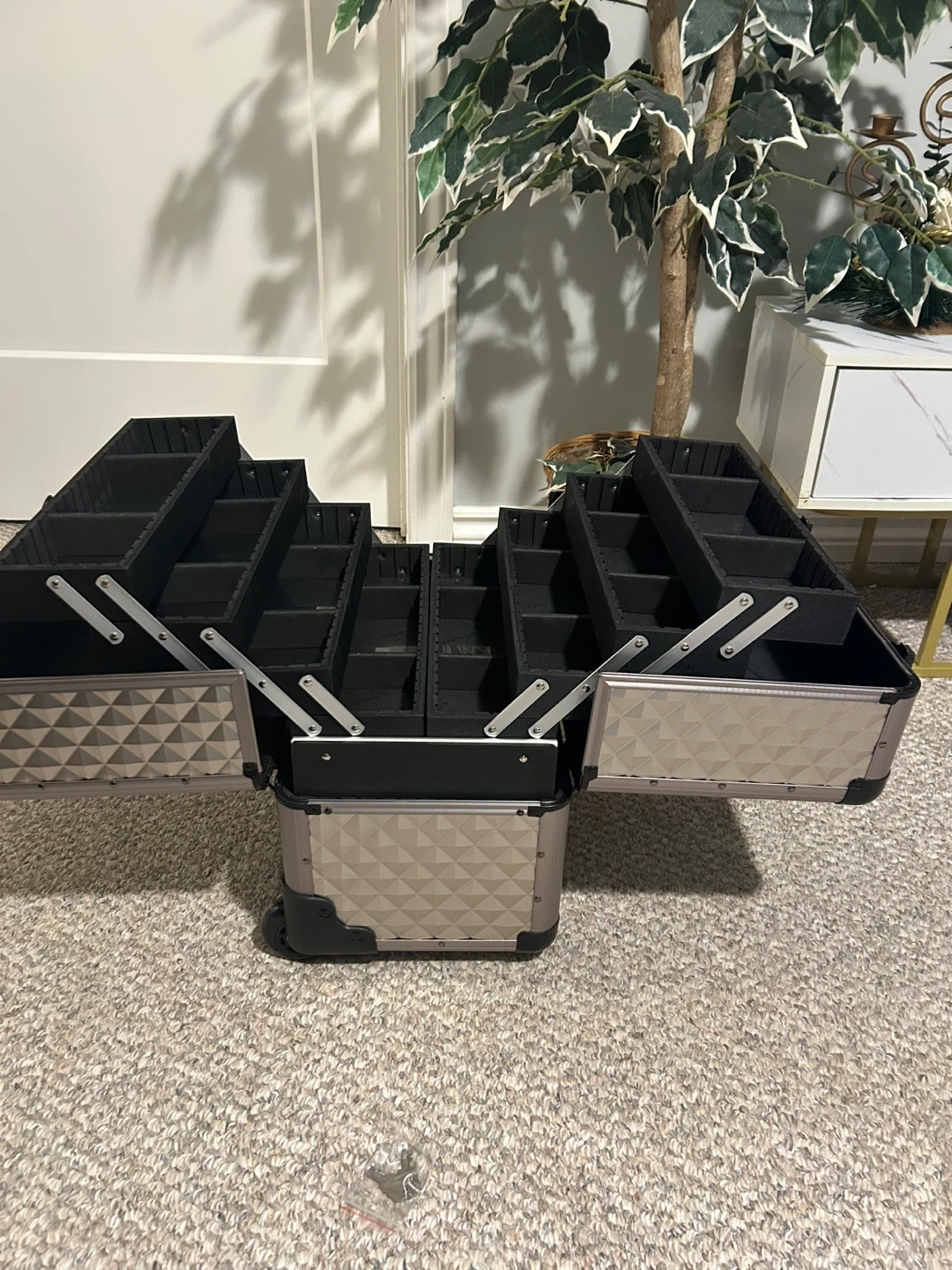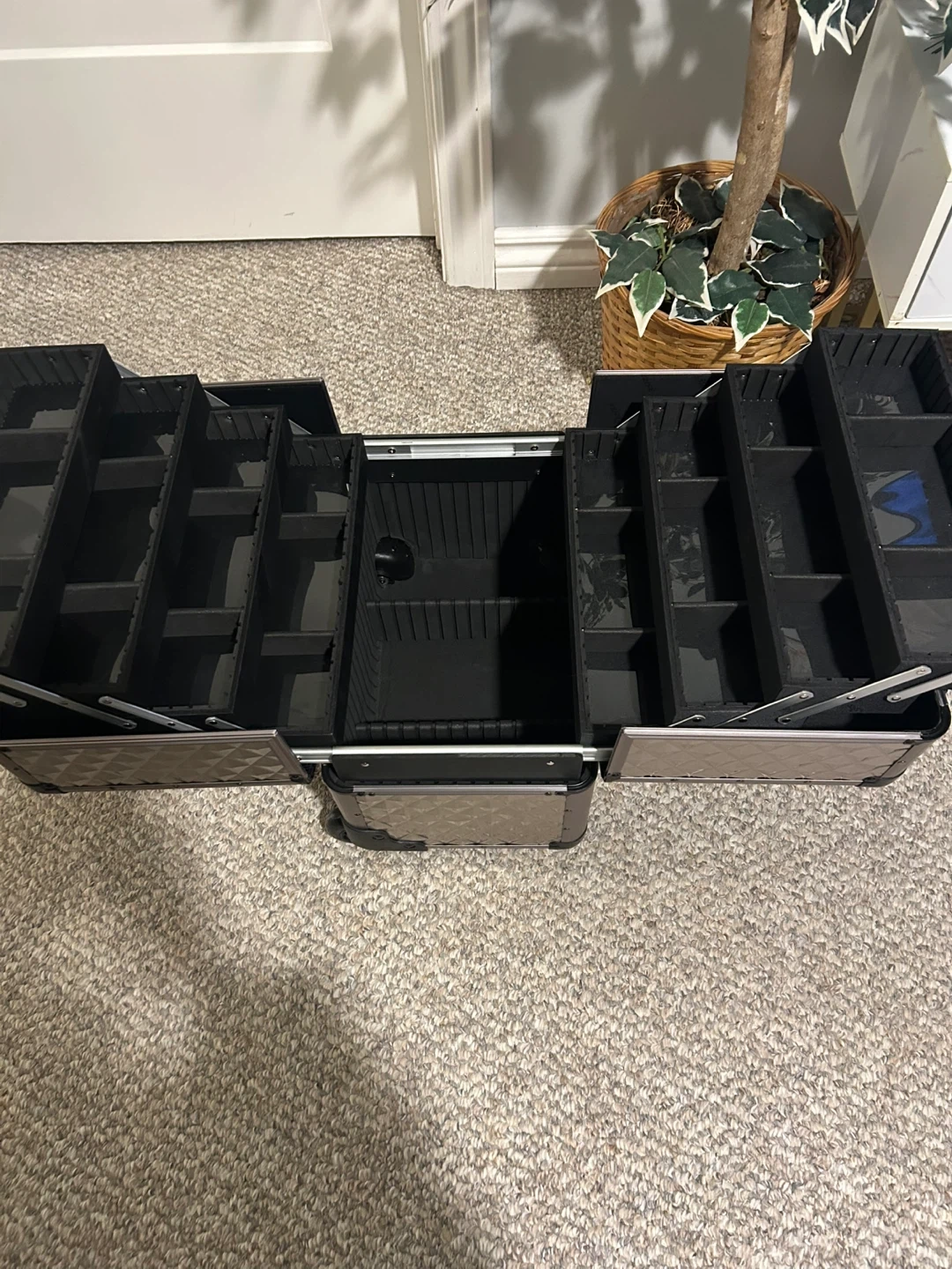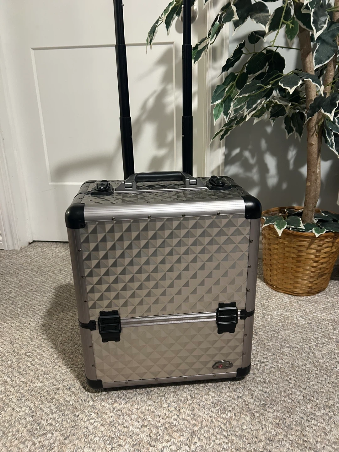 5Selling a rolling makeup train case! It's in great condition and perfect for storing and transporting all your cosmetics and beauty supplies. It features multiple compartments and trays for easy organization. The extendable handle and rolling wheels make it super convenient to move around