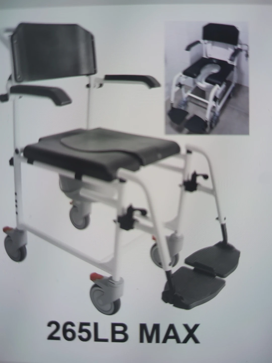 5Selling a rolling shower kmina pro commode chair. It has a maximum weight capacity of 265lbs. Great for anyone needing assistance with mobility in the bathroom