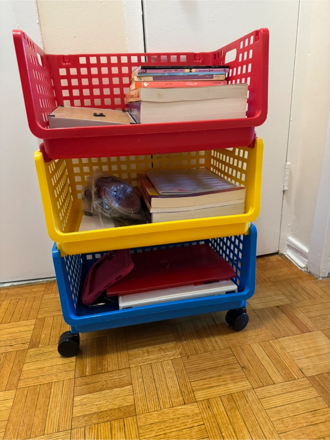 22Looking to declutter? This colourful rolling storage cart is perfect for organizing books, toys, or craft supplies! The cart features three tiers in red, yellow, and blue, and it's on wheels so it's easy to move around