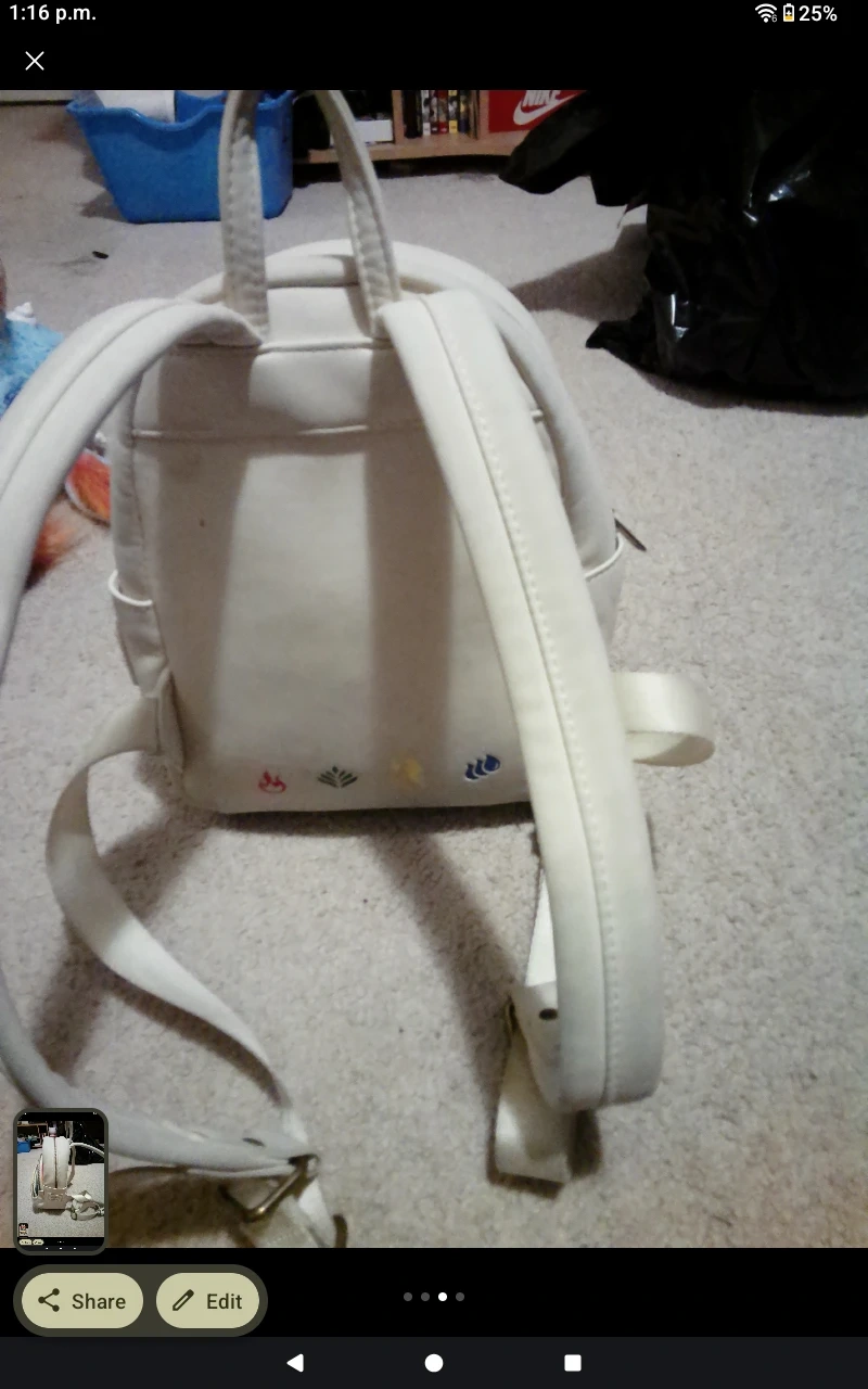 This is a cute Loungefly mini backpack featuring Pokemon designs like Charmander, Flareon, and Bulbasaur. It's made of faux leather and has a white exterior with colourful character art. The interior lining has a repeating pattern of Pokemon icons. It's a fun accessory for any Pokemon fan!