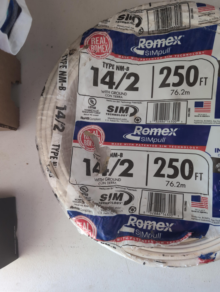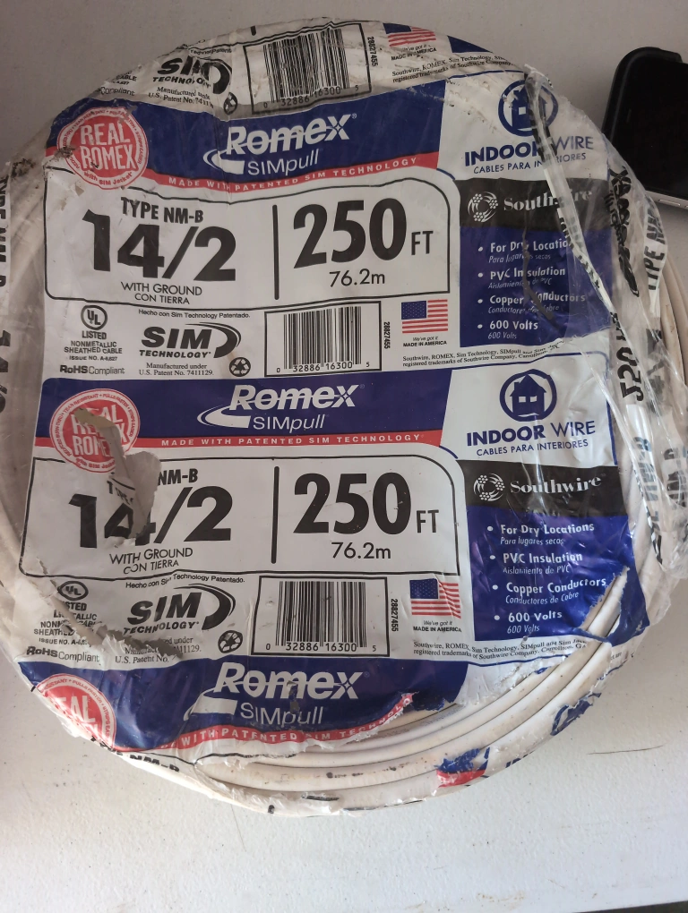 Selling a roll of Romex Simpull NM-B 14/2 wire. It's 250 feet long and suitable for indoor wiring projects. Perfect for dry locations and rated for 600 Volts