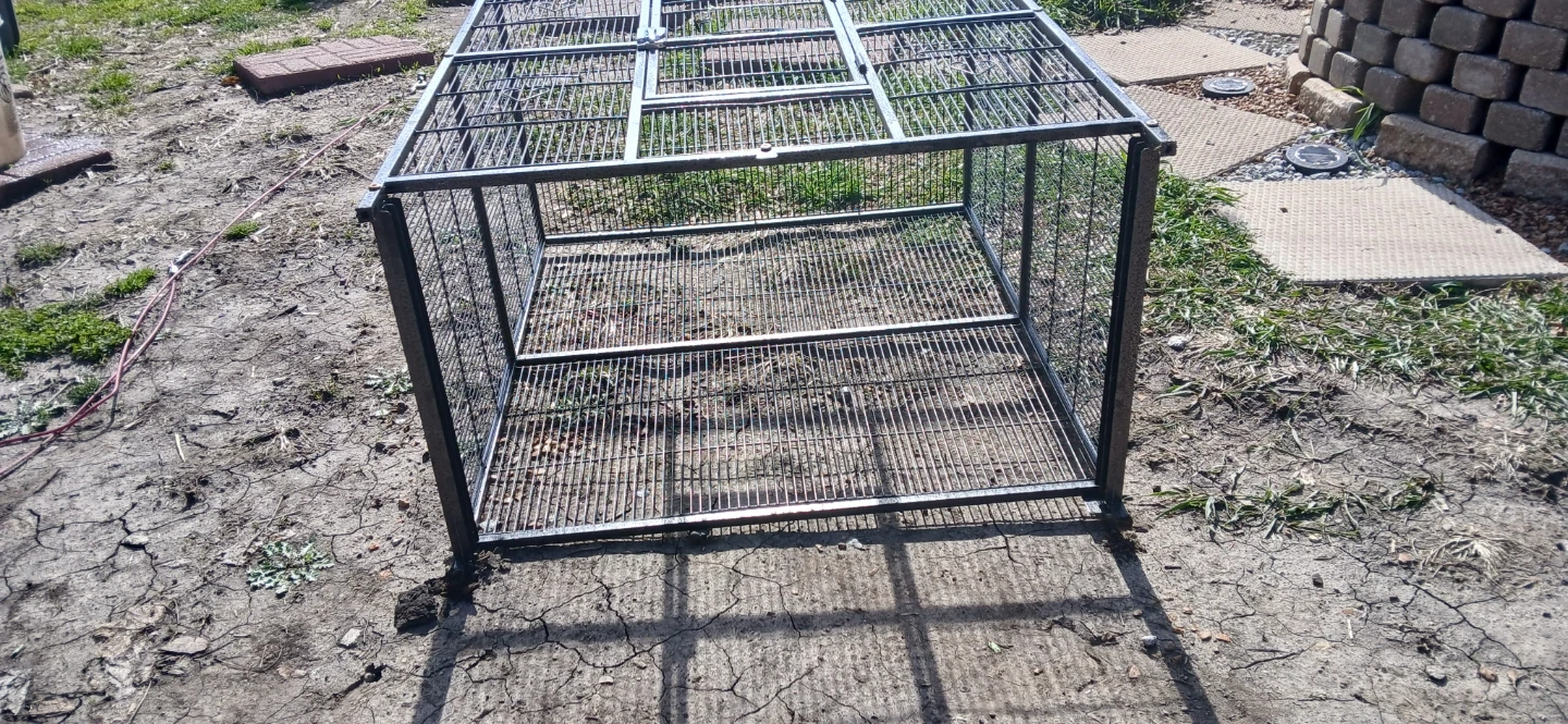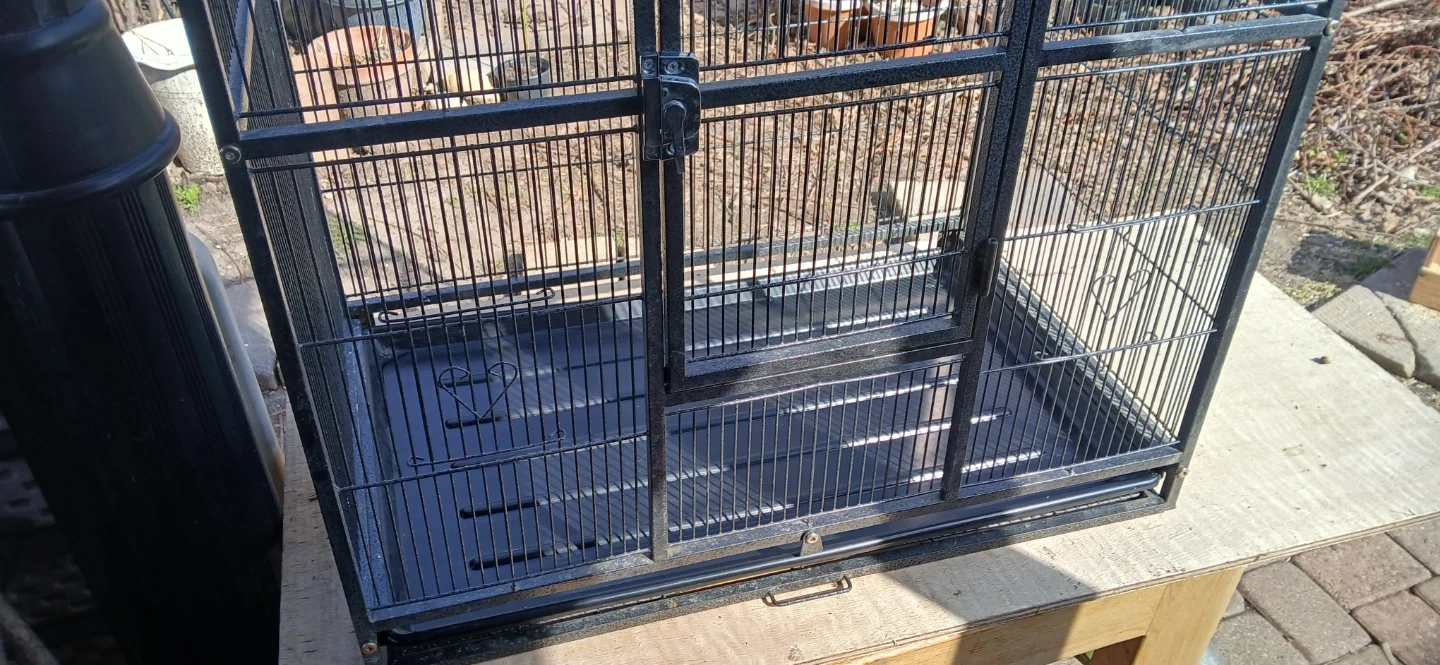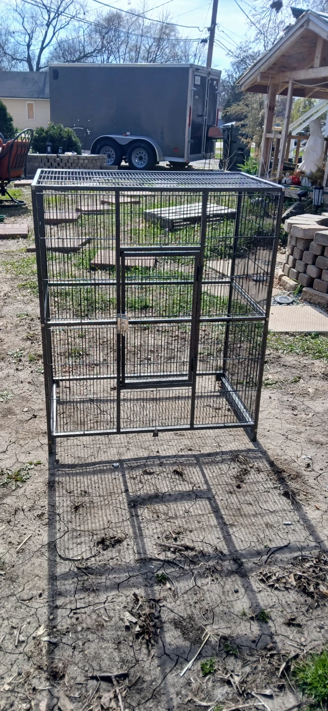This is a large metal bird cage with multiple levels and access doors. It includes two removable trays for easy cleaning. The wire spacing is suitable for medium to large birds.