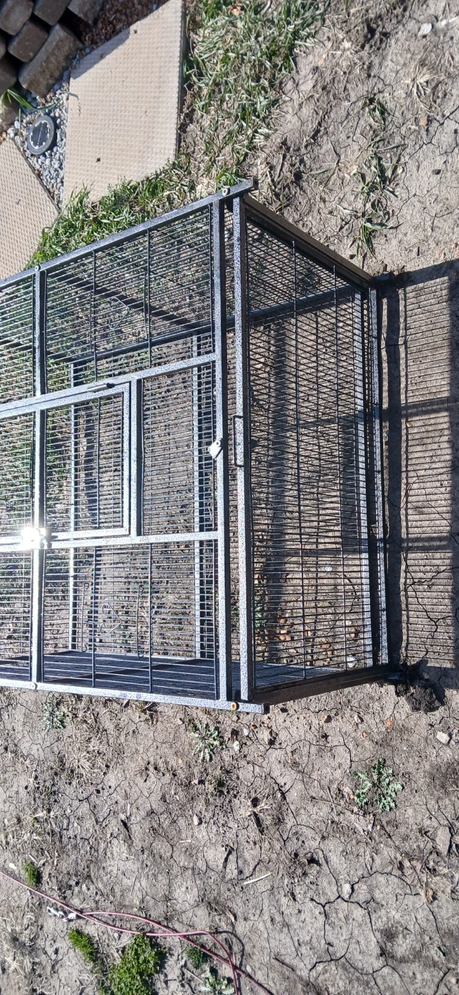 This is a large metal bird cage with multiple levels and access doors. It includes two removable trays for easy cleaning. The wire spacing is suitable for medium to large birds.