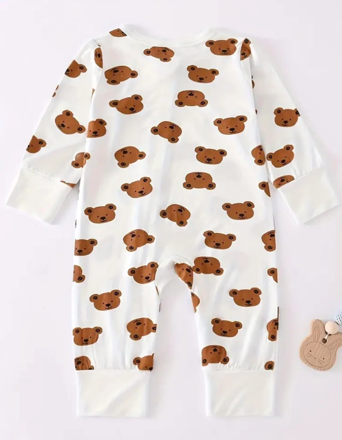 Super cute baby onesie with a bear print! It's sized for 1-3 months. The material is soft and comfy, made of 95% Viscose from bamboo and 5% Spandex.