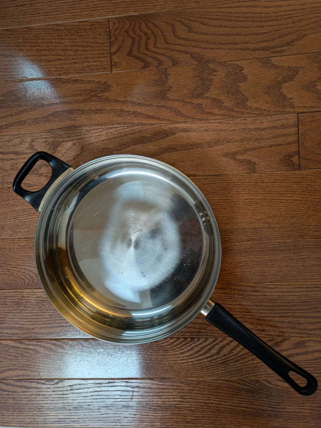This Super Pan frying pan is made of stainless steel. It has a durable handle for a comfortable grip. The bottom measures 28cm.