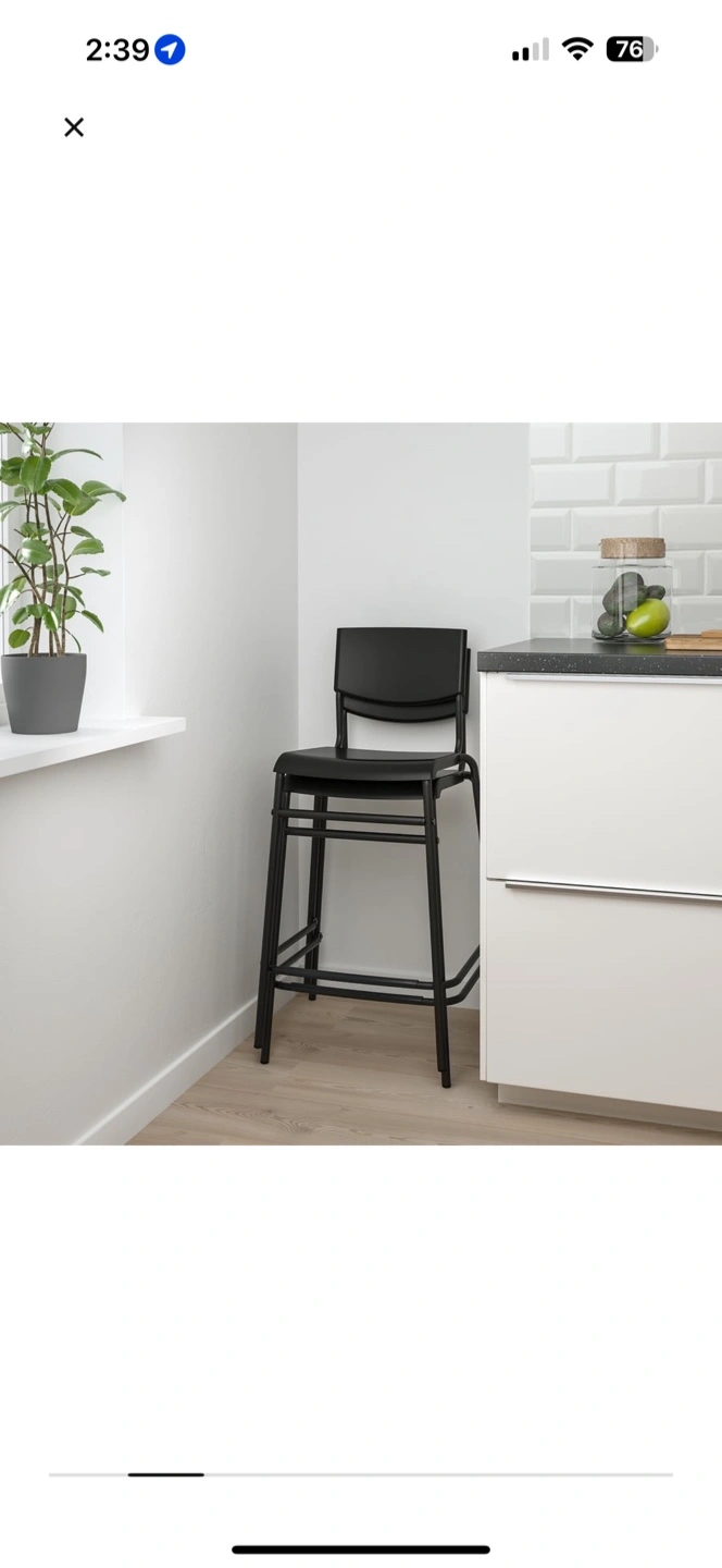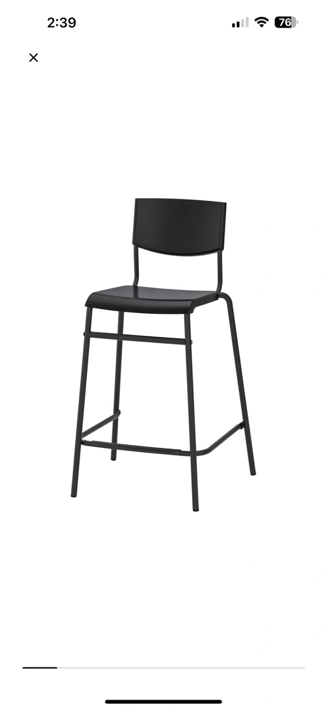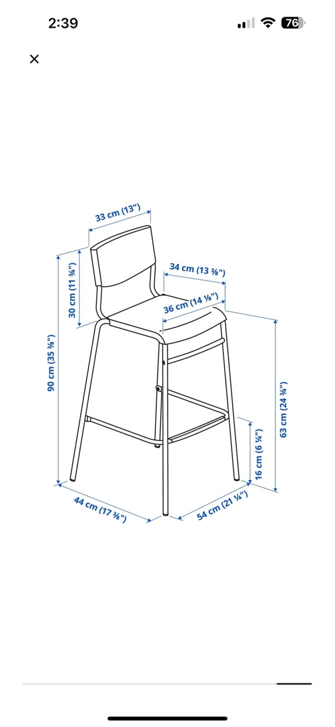 Selling a black IKEA Franklin bar stool. It's in great shape and ready for a new home! Dimensions are approximately 90 cm (35 3/8") tall, 44 cm (17 3/8") wide, and 54 cm (21 1/4") deep
