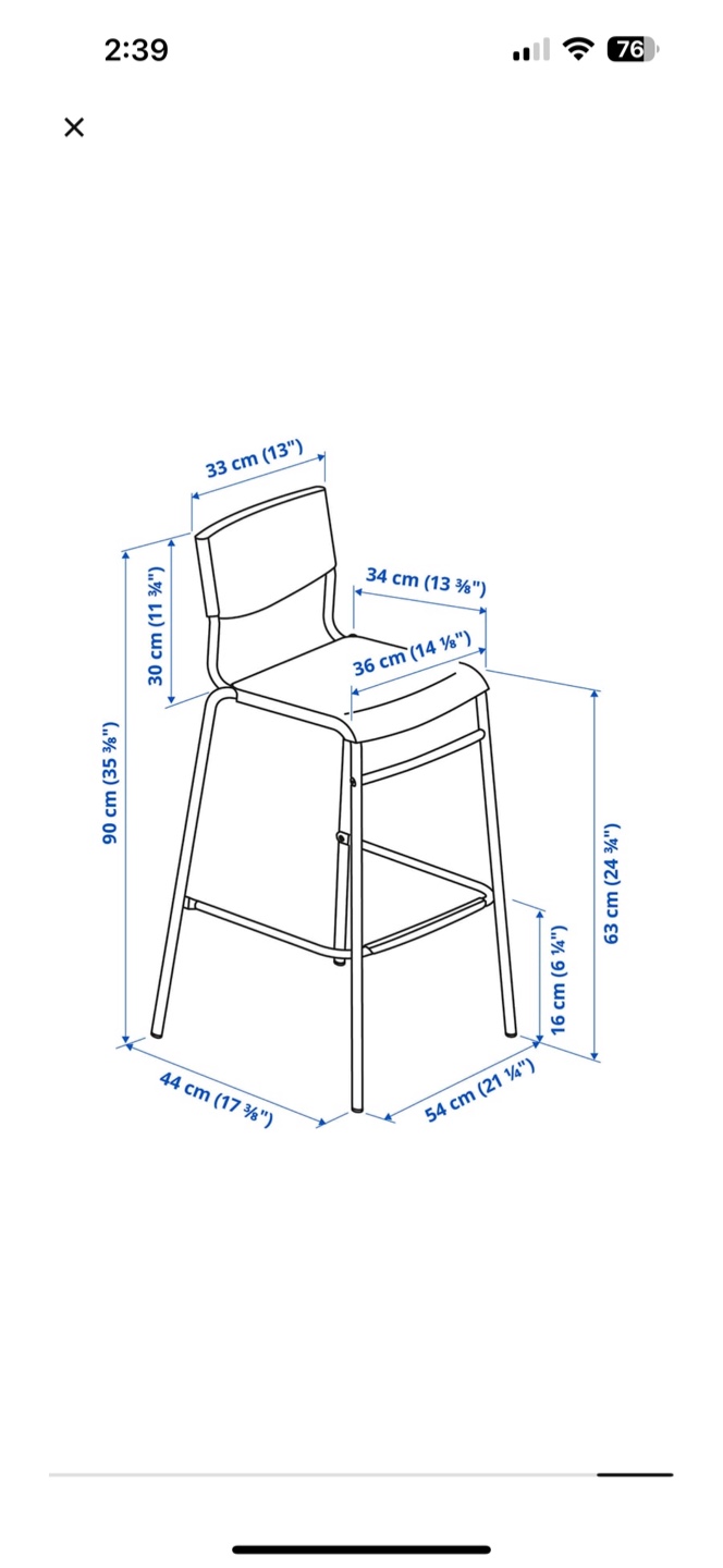 Selling a black IKEA Franklin bar stool. It's in great shape and ready for a new home! Dimensions are approximately 90 cm (35 3/8") tall, 44 cm (17 3/8") wide, and 54 cm (21 1/4") deep