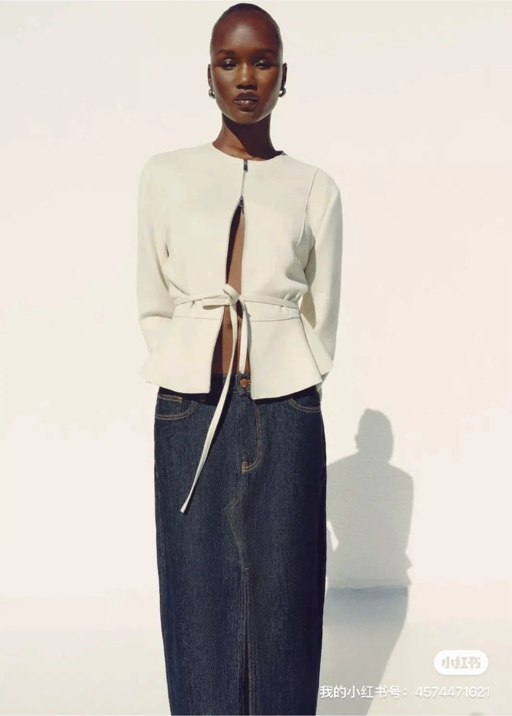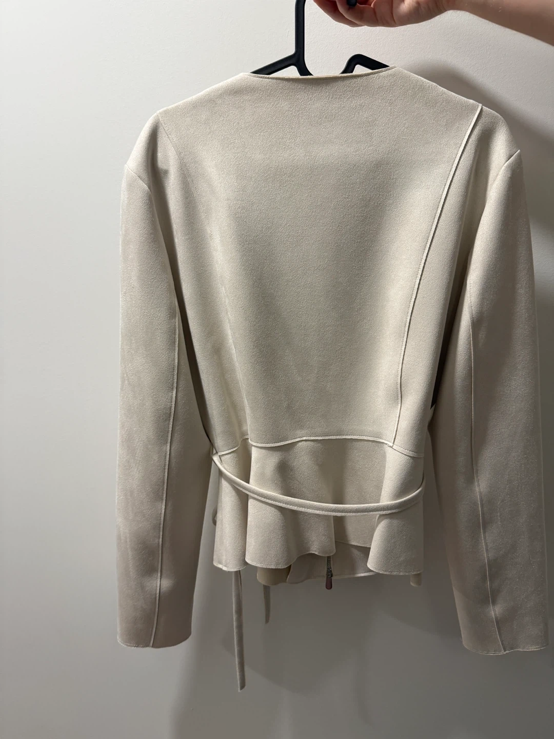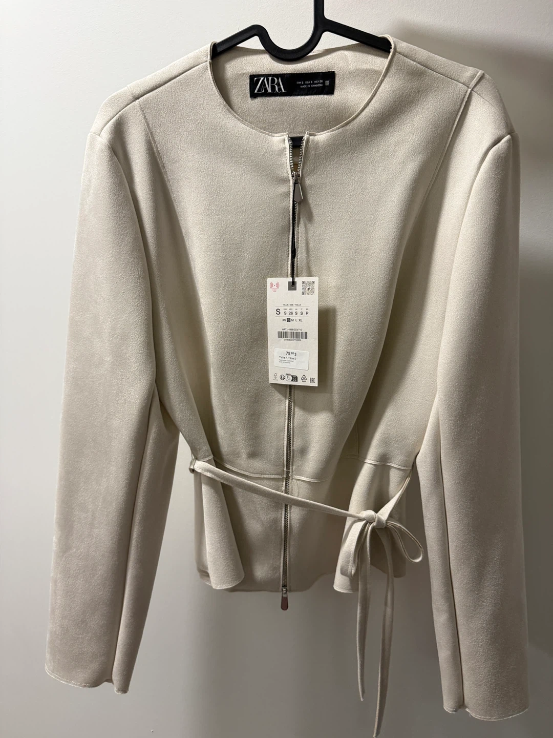 Selling a Zara jacket in size small. It's a beautiful beige colour and made of a soft faux suede material. Features a zip-up front and a tie waist for a flattering fit. Perfect for layering!