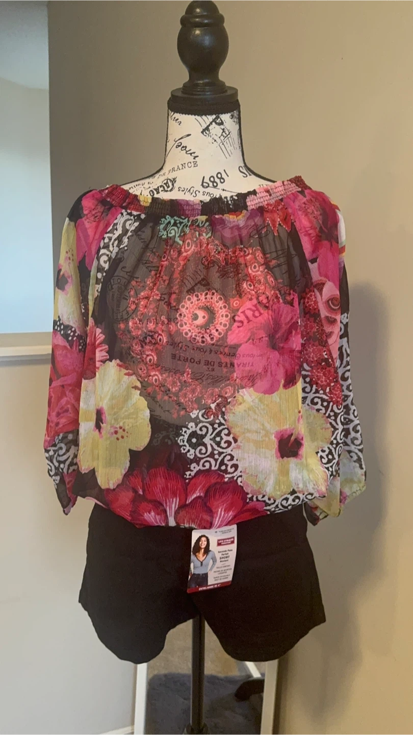 This is a cute, colourful floral sheer blouse. It's a size small and would be a great addition to any wardrobe!