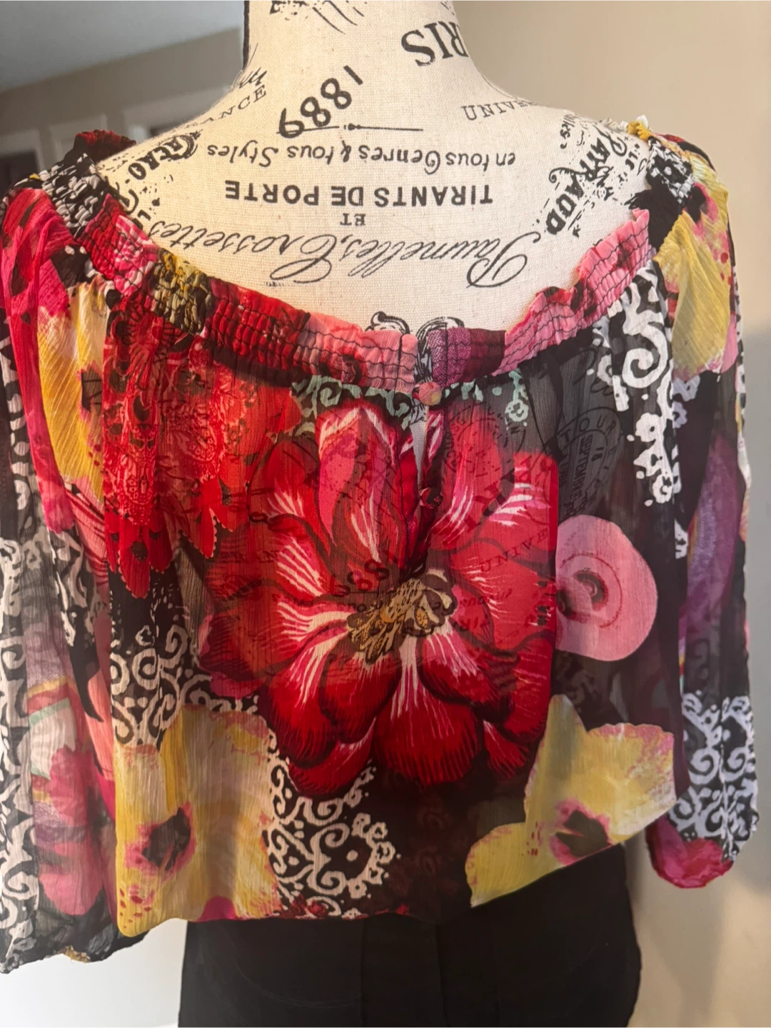This is a cute, colourful floral sheer blouse. It's a size small and would be a great addition to any wardrobe!