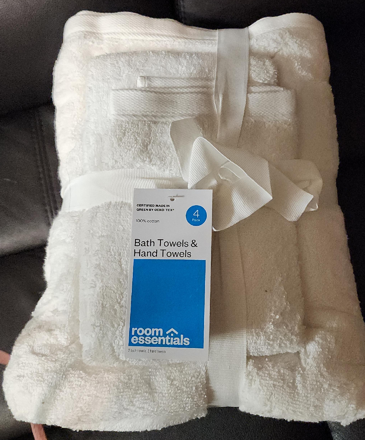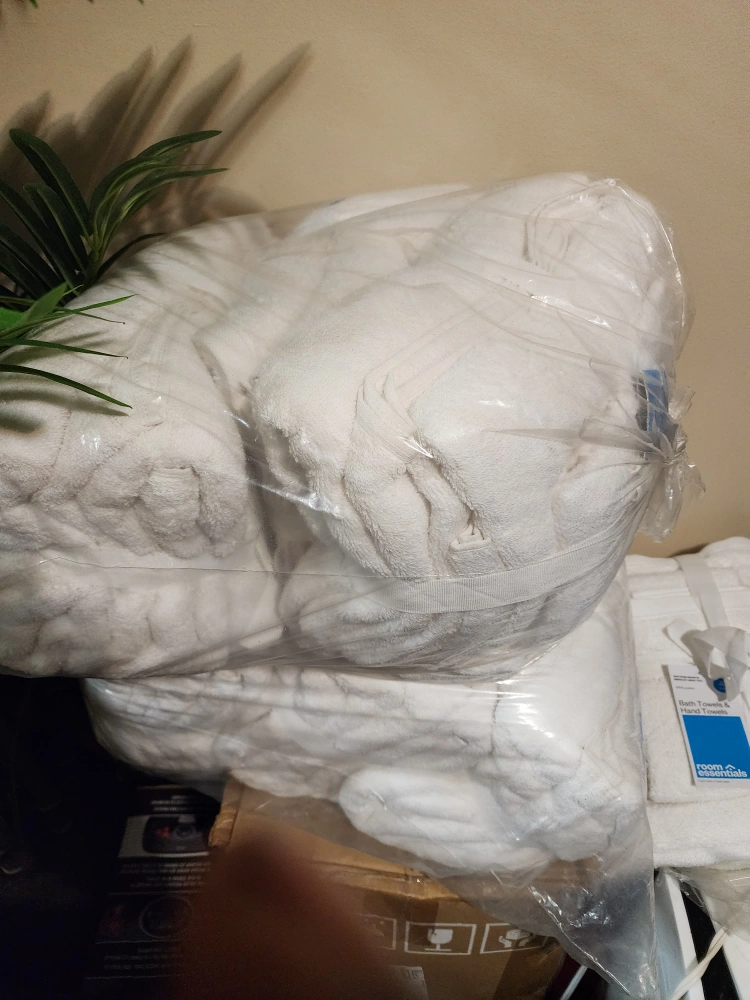 I'm selling a brand new Room Essentials 4-pack of bath towels and hand towels. This set includes 2 bath towels and 2 hand towels. They are made of 100% cotton and are a bright white colour. Perfect for a bathroom refresh!