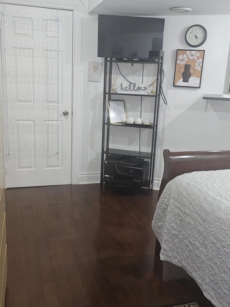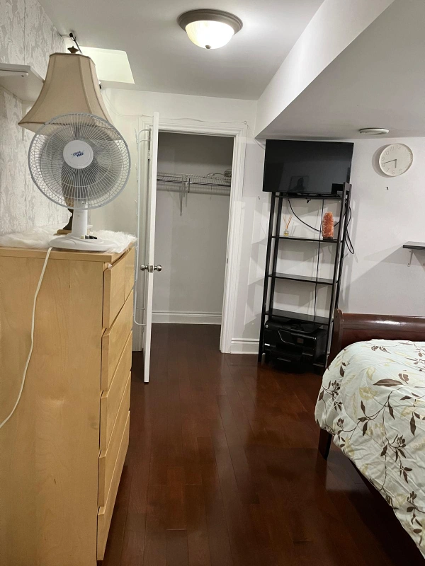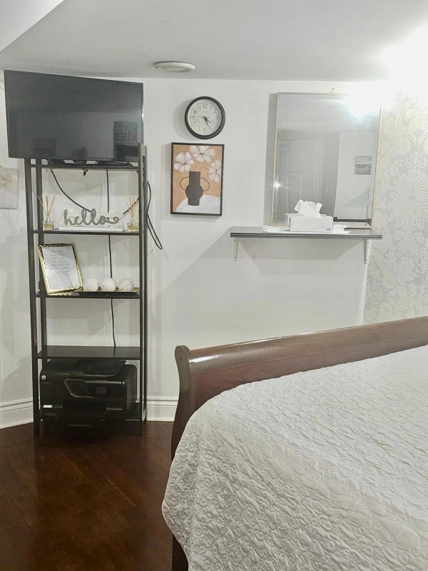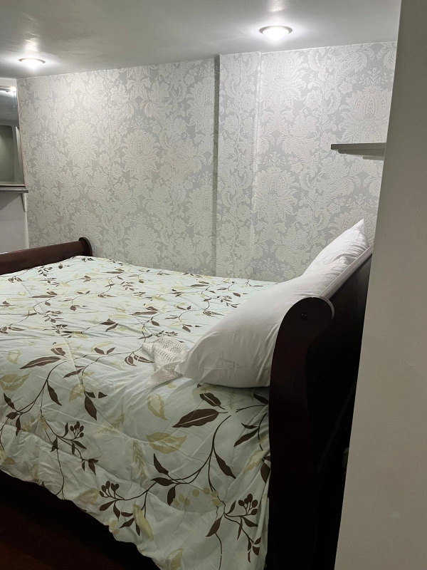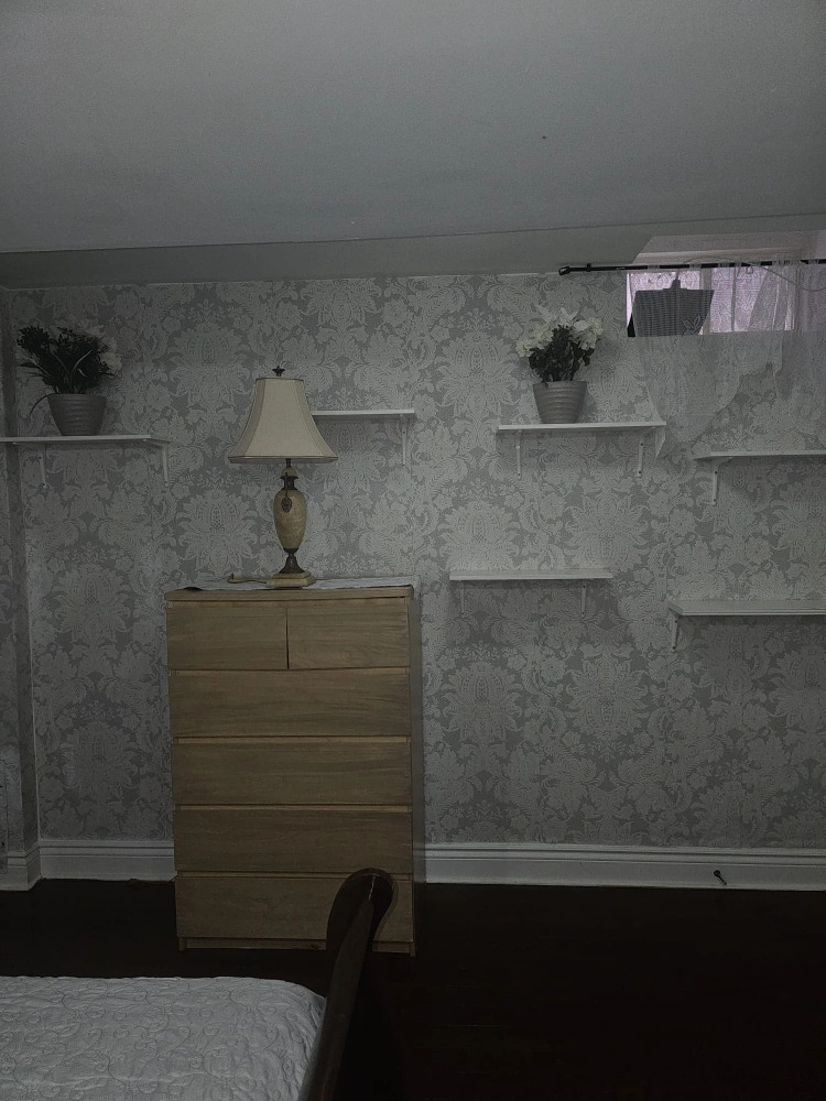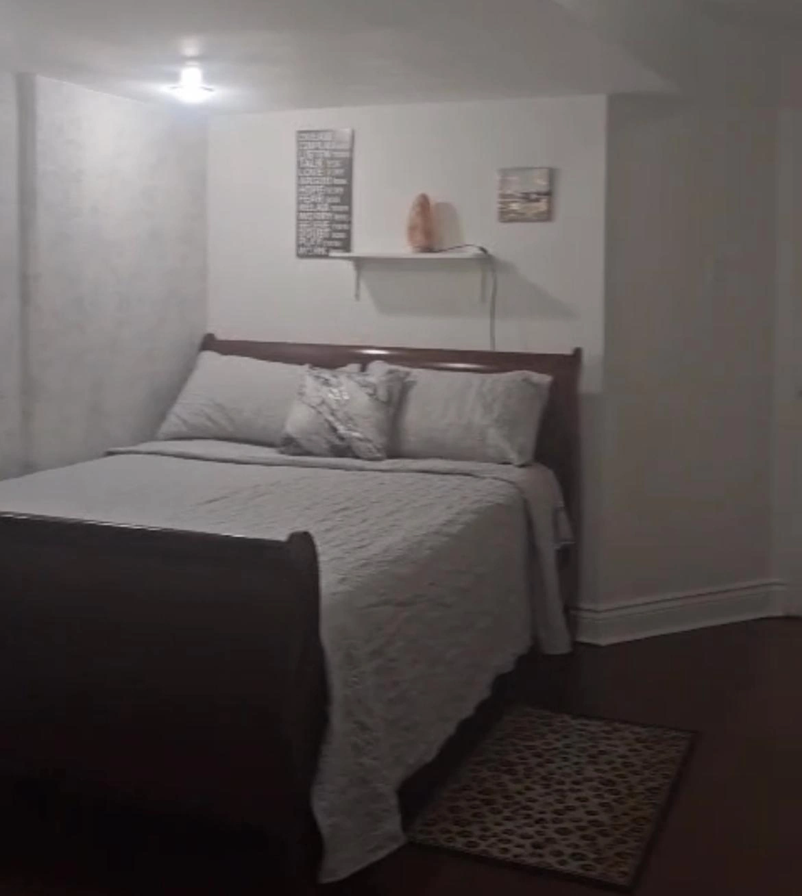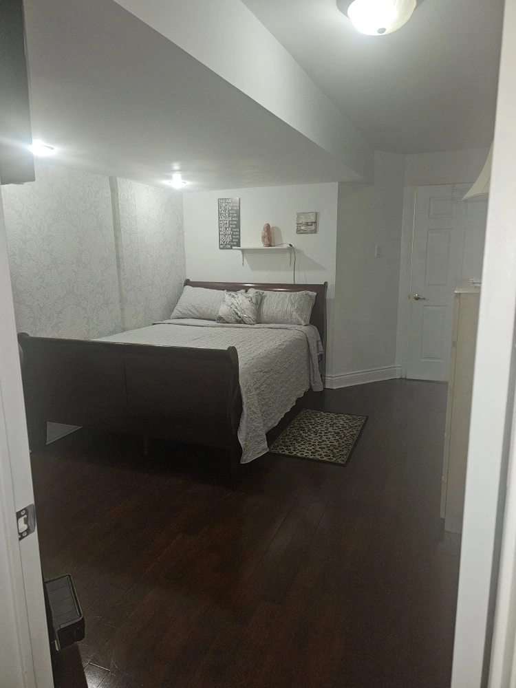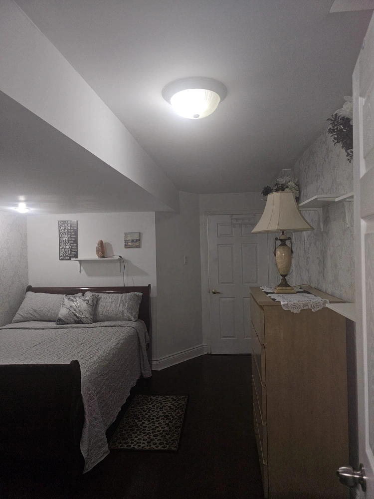 12Bedroom set with a bed and dresser. The bed has a dark wood frame and light-coloured bedding. There is also a dresser in the room. Great for furnishing a bedroom!
