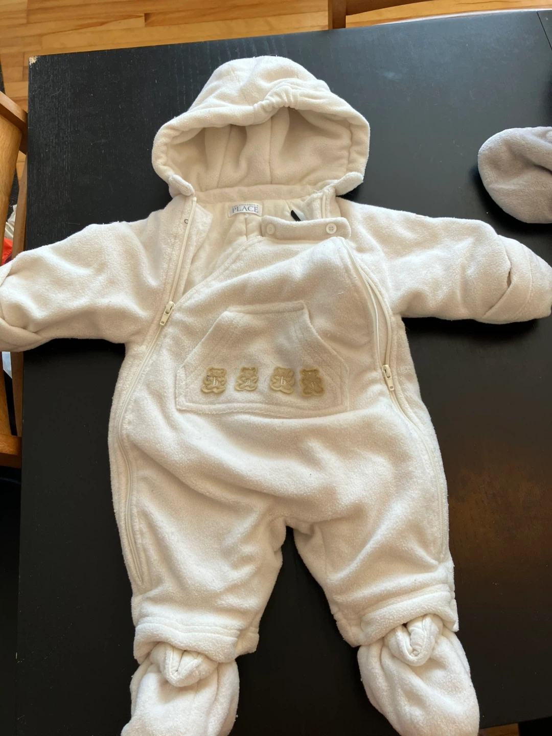 This cozy cream fleece snowsuit is from The Children's Place. It features a full zip front and attached hood. There are cute bear appliques on the chest pocket. The attached feet keep little toes warm!