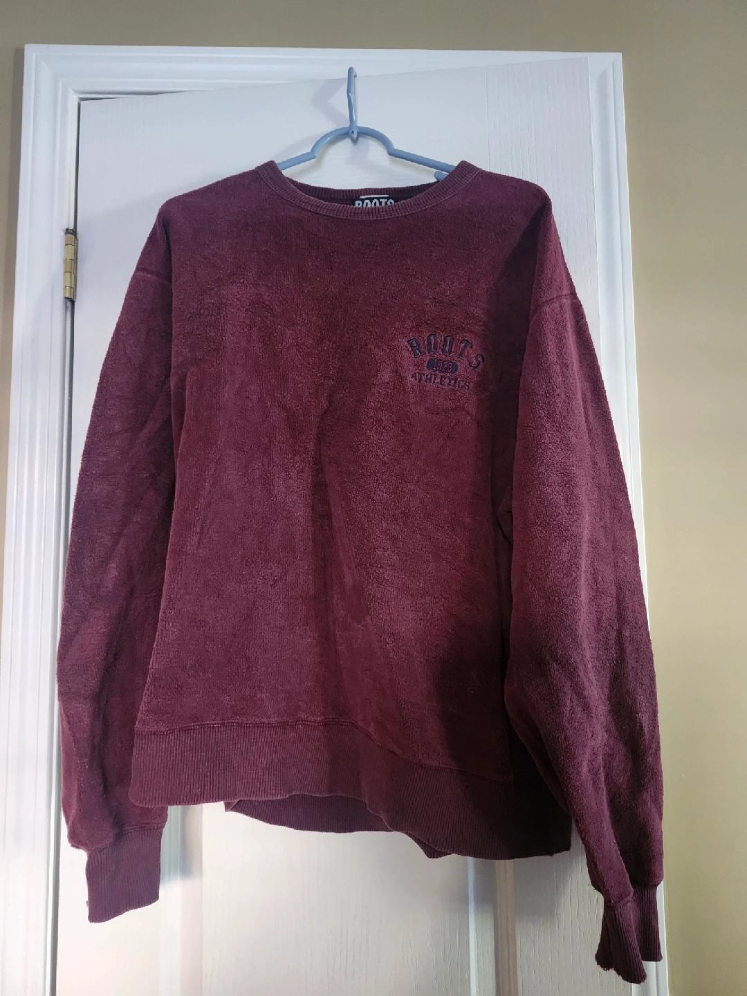 Selling a comfy Roots Athletics crewneck in burgundy. It's in great shape and ready for a new home! The material is soft and cozy, perfect for those chilly Canadian evenings. It features the classic Roots logo embroidered on the front.