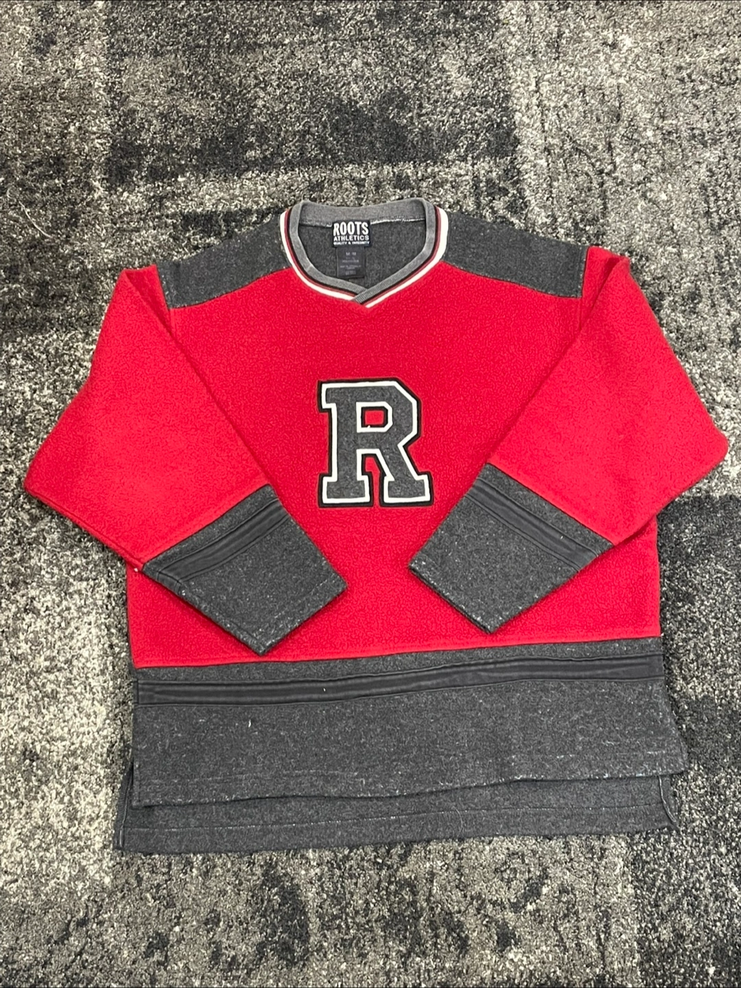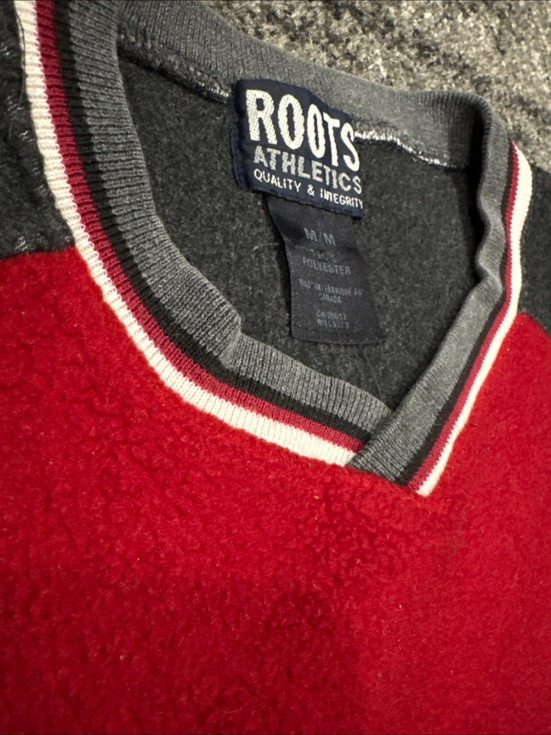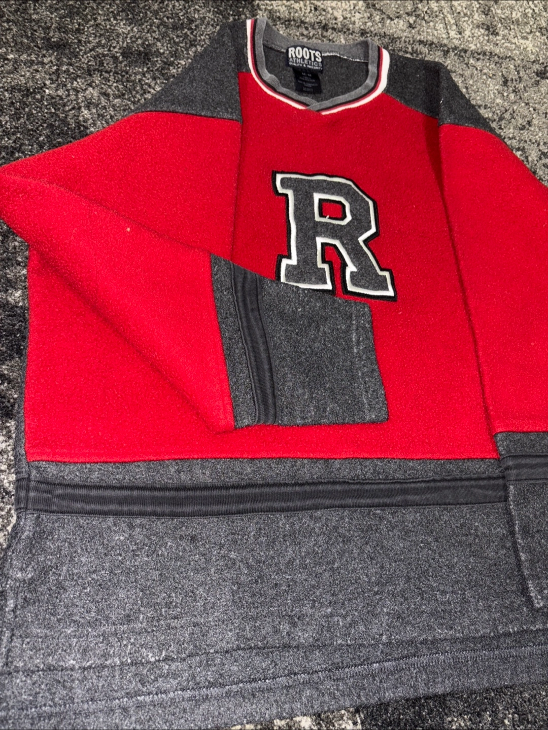 Vintage Roots Athletics sweater. Red and grey colour block design. Features a large felt 'R' on the chest. V-neck. Long sleeves. Great casual wear. Unisex.