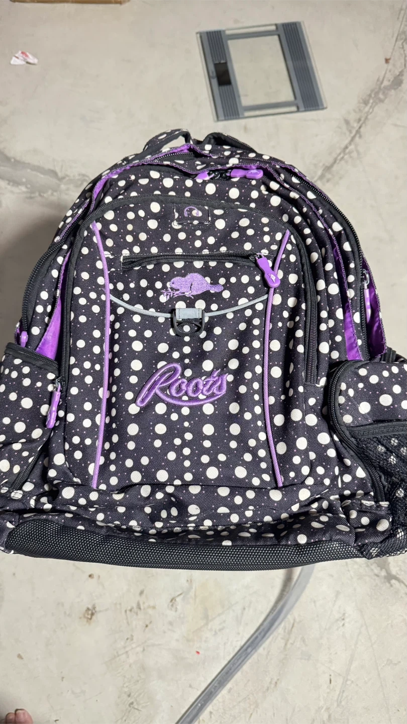 38This is a cute Roots backpack, perfect for school or travel! It features a black background with white polka dots and fun purple accents. It has multiple compartments for organizing your belongings. Pick up near Grace Hospital, cant deliver.