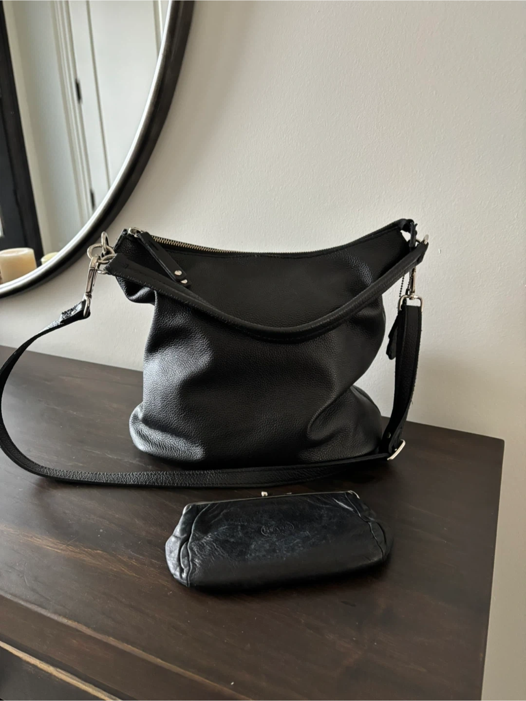 60Selling a Roots black leather shoulder bag with a matching coin purse. Both are in great condition and made of genuine leather. The bag has an adjustable shoulder strap and a zippered closure. Perfect for everyday use!