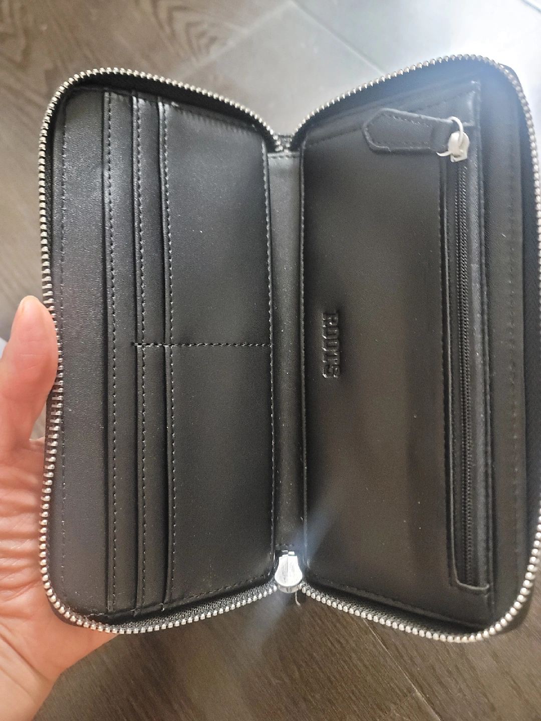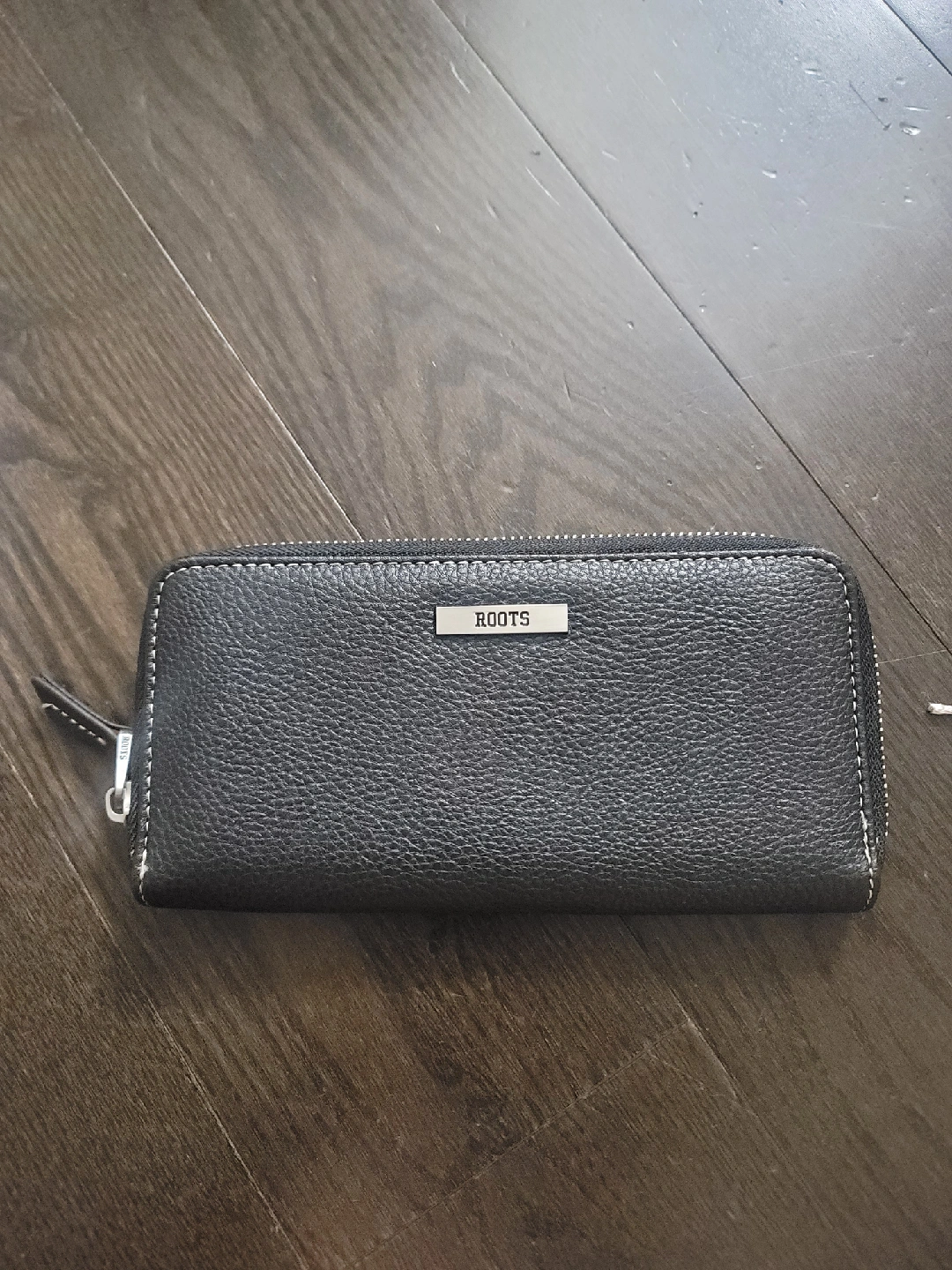 Selling a Roots black leather zip-around wallet! It's in great condition and has lots of space for cards and cash. The zipper works perfectly, and the leather is soft and durable